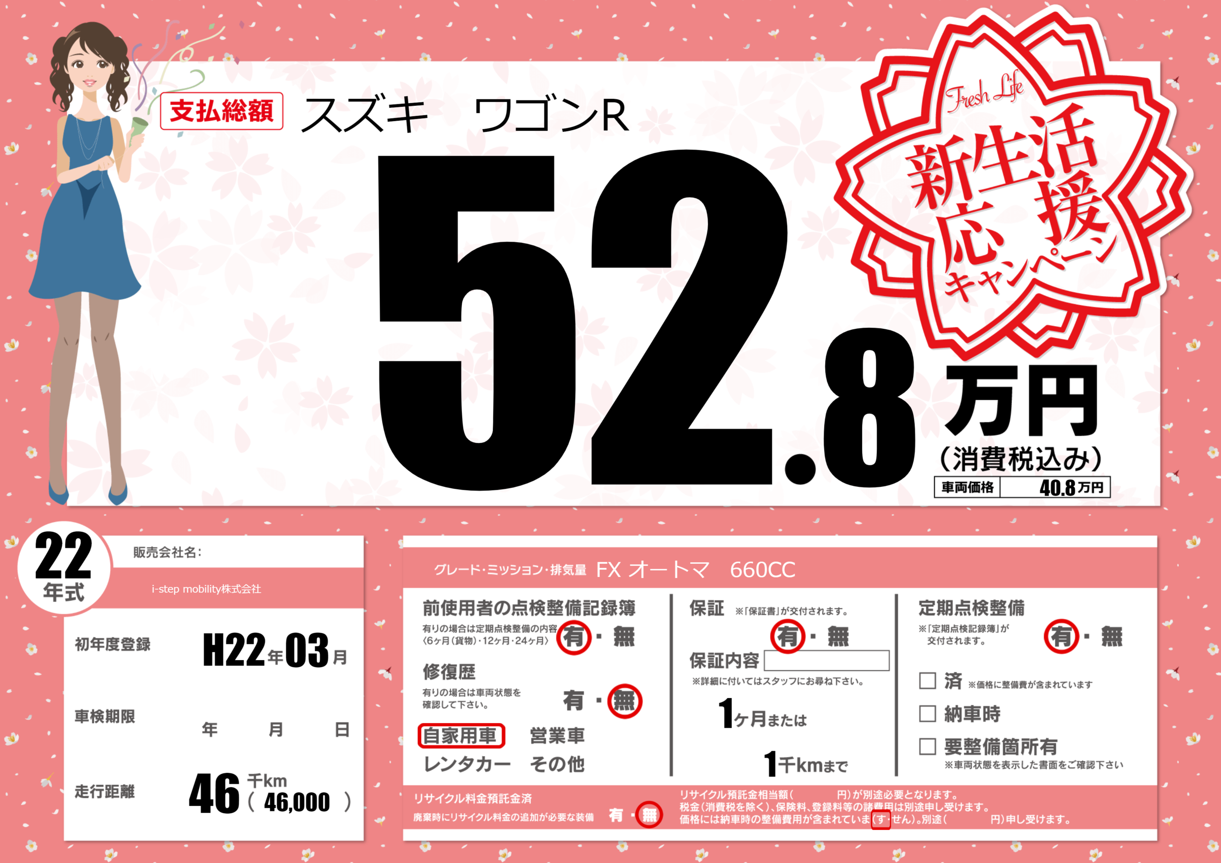 | 走行キロ | 4.6万km | 初年度登録 | H22年03月 |