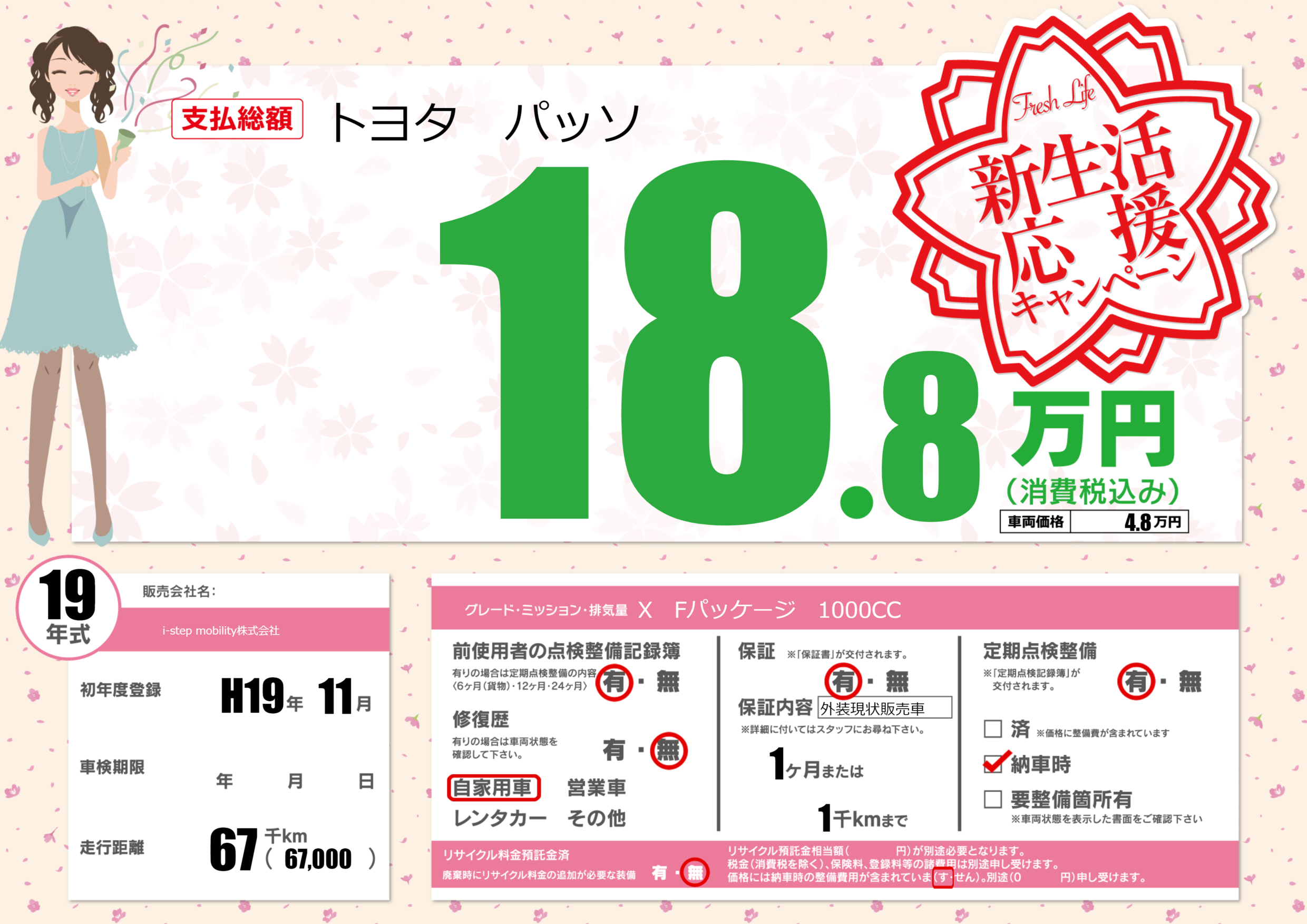 | 車名 | トヨタ パッソ | グレード ミッション 排気量 |