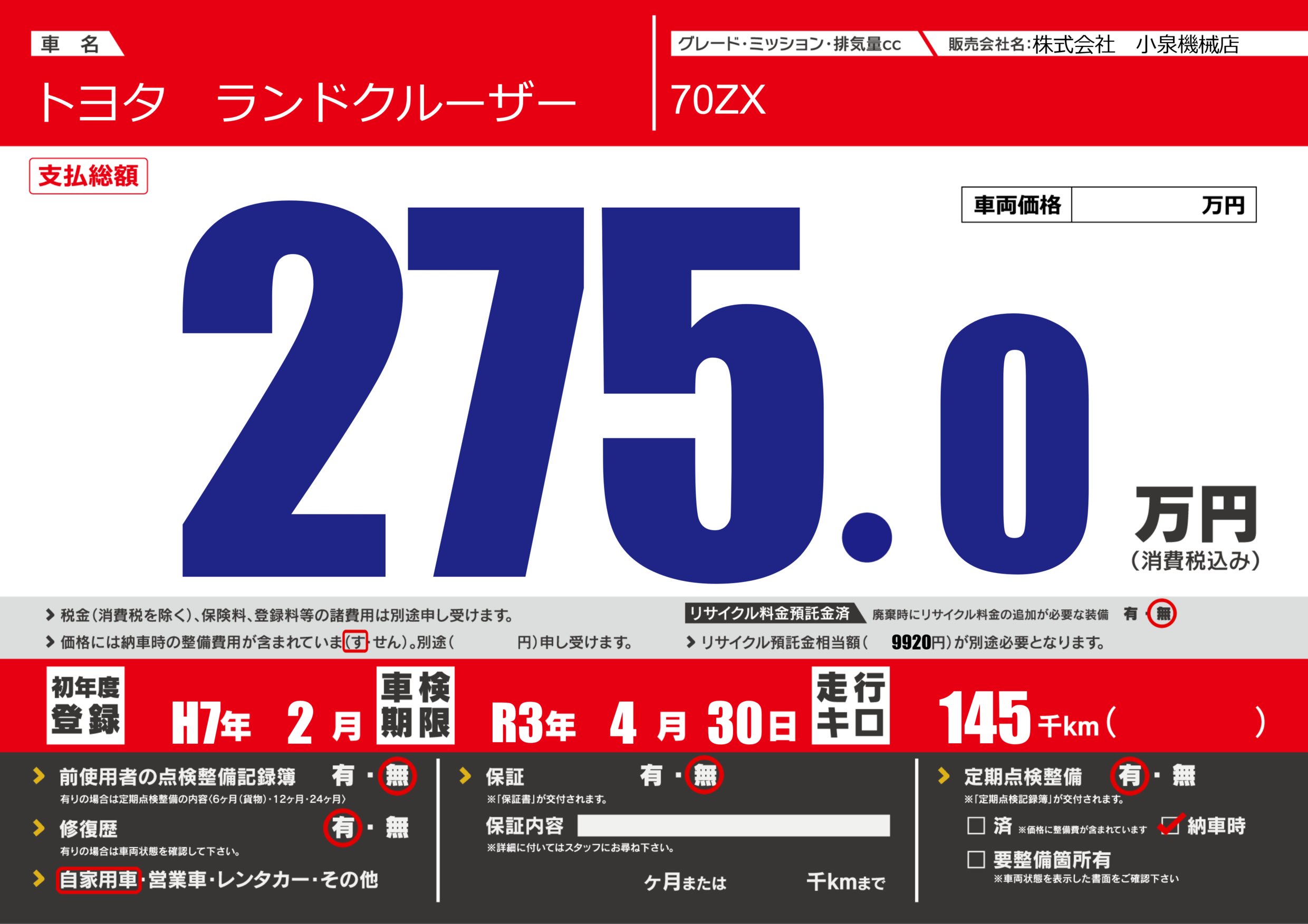 | 走行キロ | 14.5万km | 初年度登録 | H7年2月 |