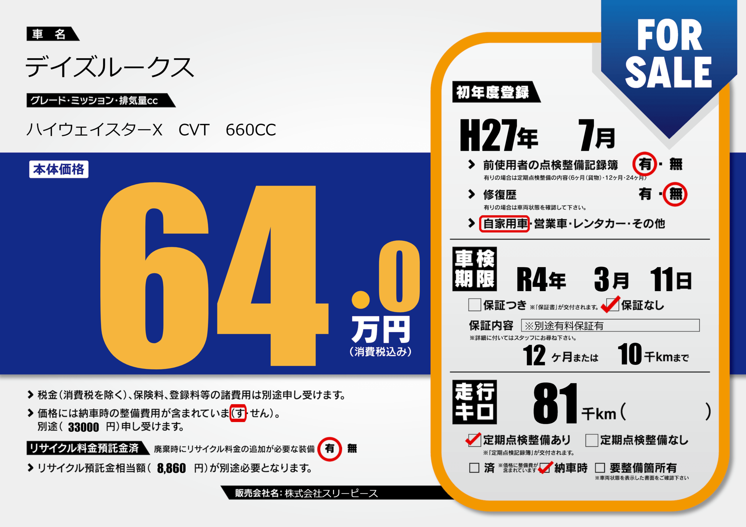 | 走行キロ | 8.1万km | 初年度登録 | H27年7月 |