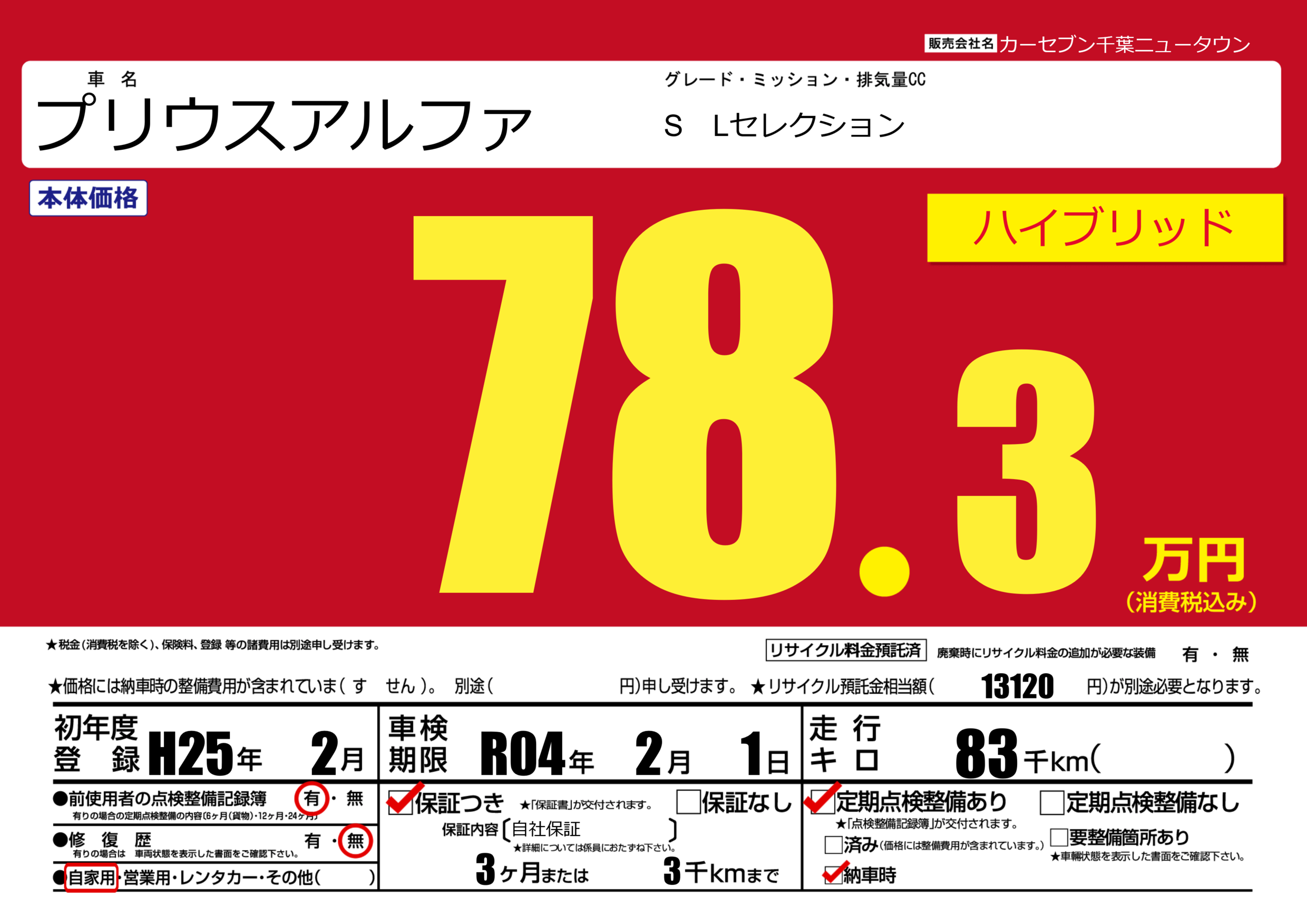 | 車名 | プリウスアルファ | グレード ミッション 排気量 |