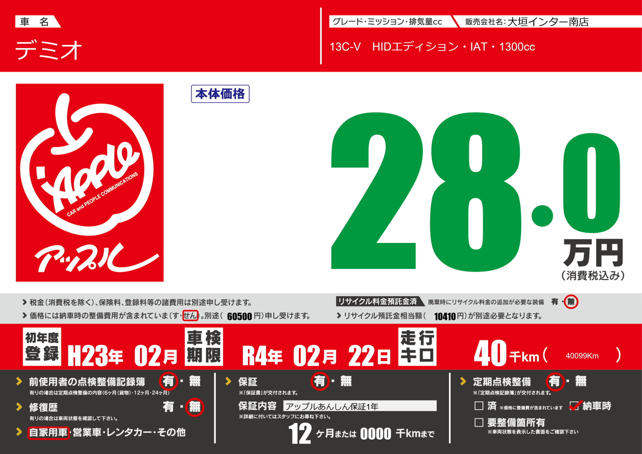 | 車名 | デミオ | グレード ミッション 排気量 |