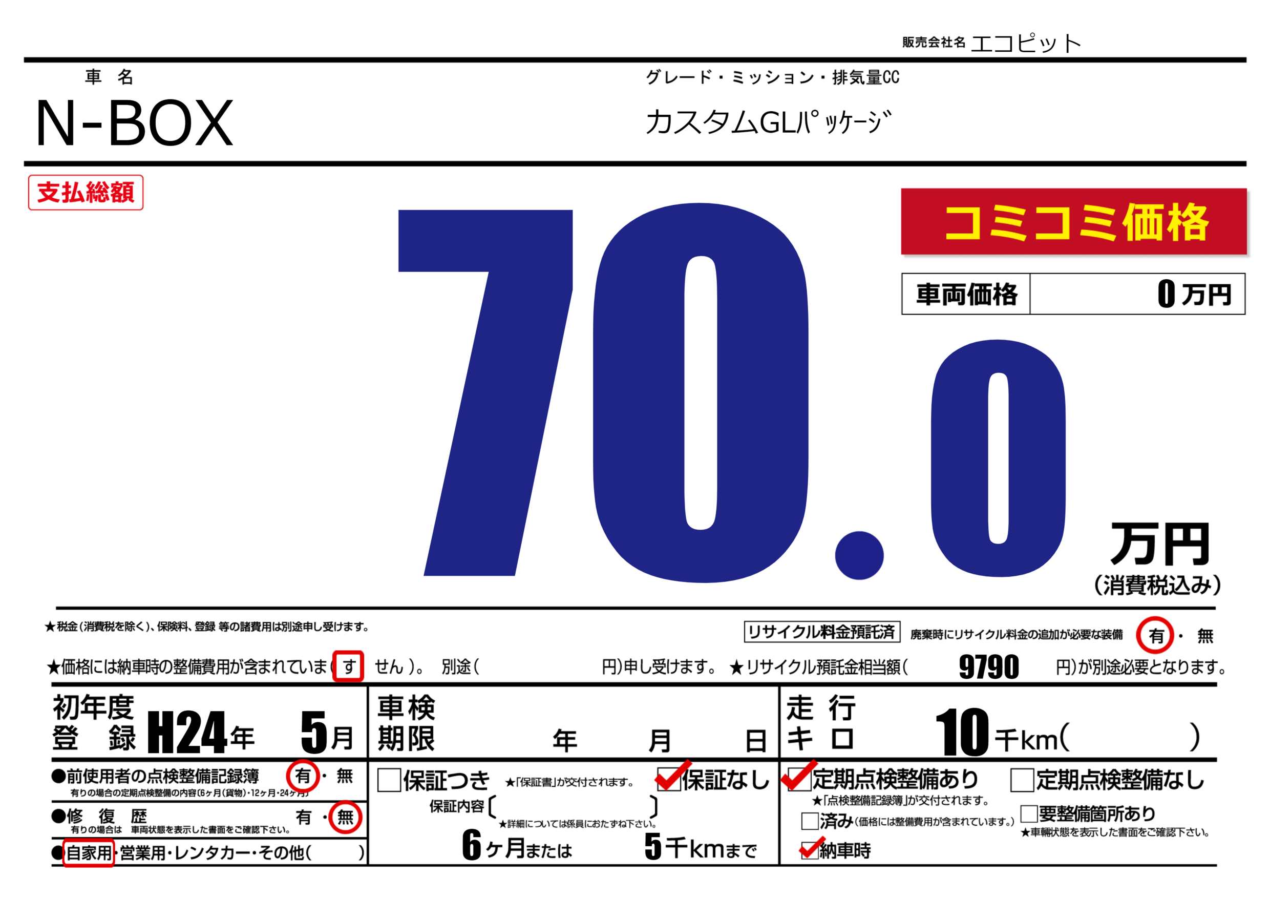 | 定期点検整備 | 定期点検整備あり 納車時あり | ||