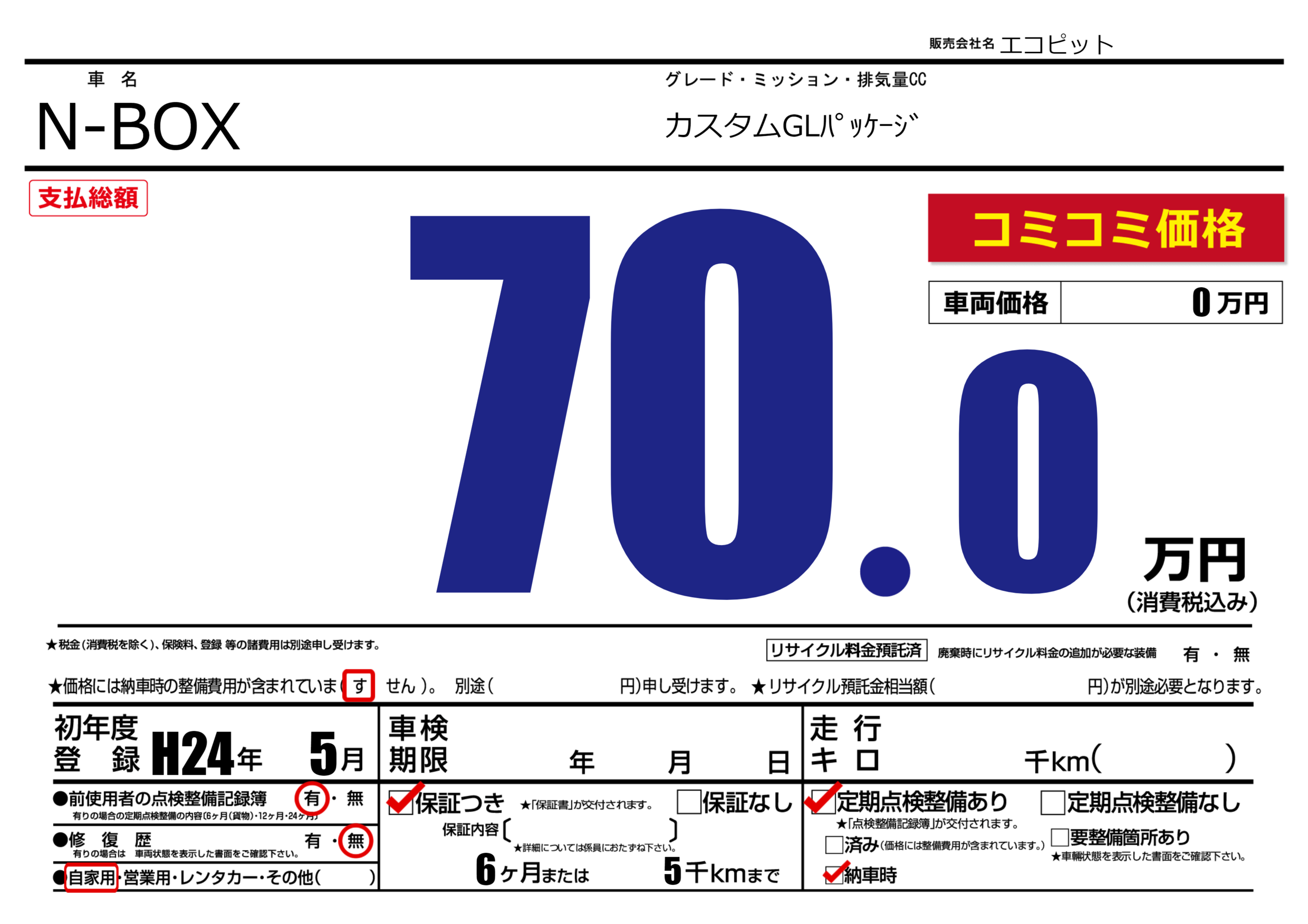 | 定期点検整備 | 定期点検整備あり 納車時あり | ||