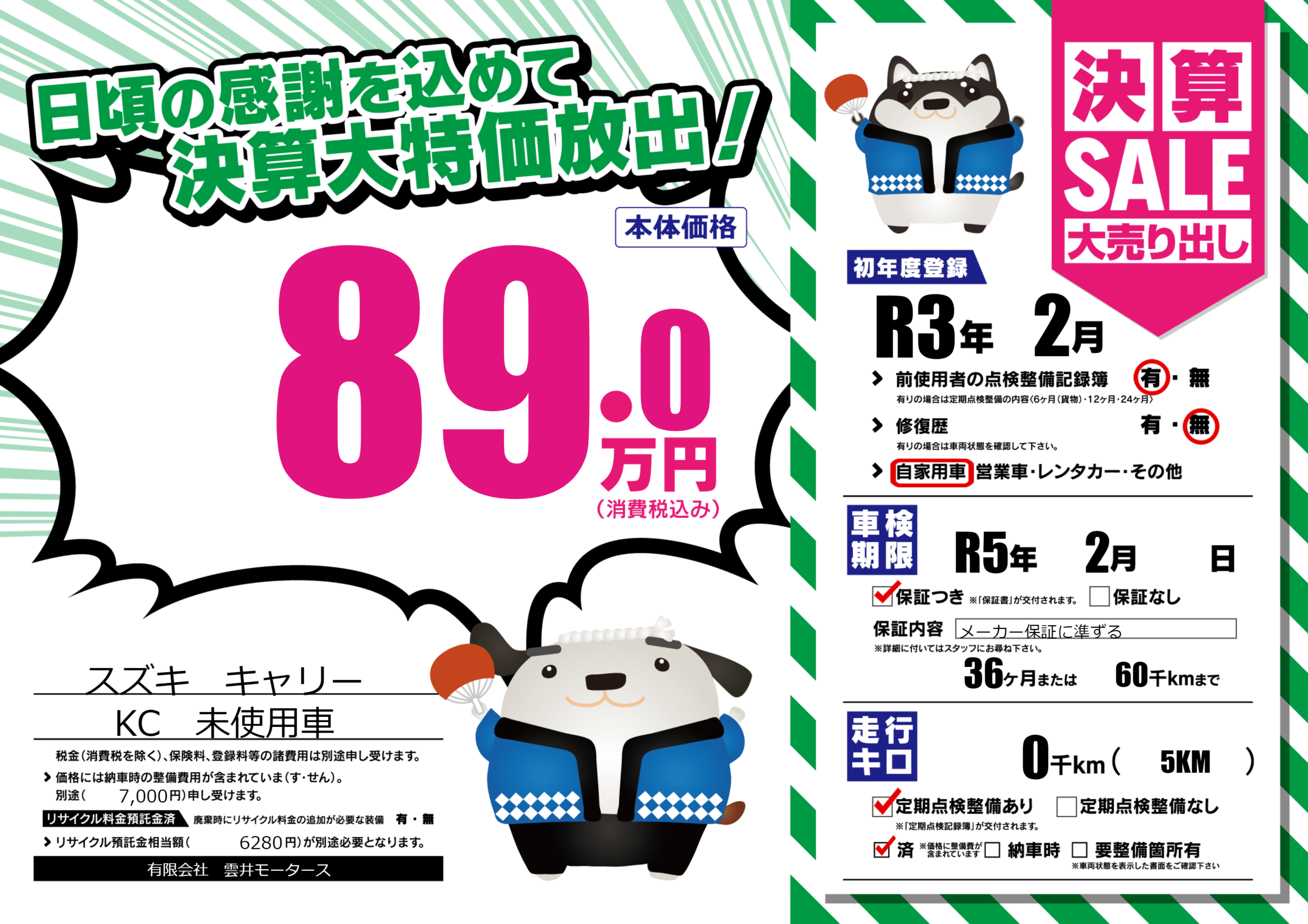 | 定期点検整備 | 定期点検整備あり 定期点検整備済み | ||
