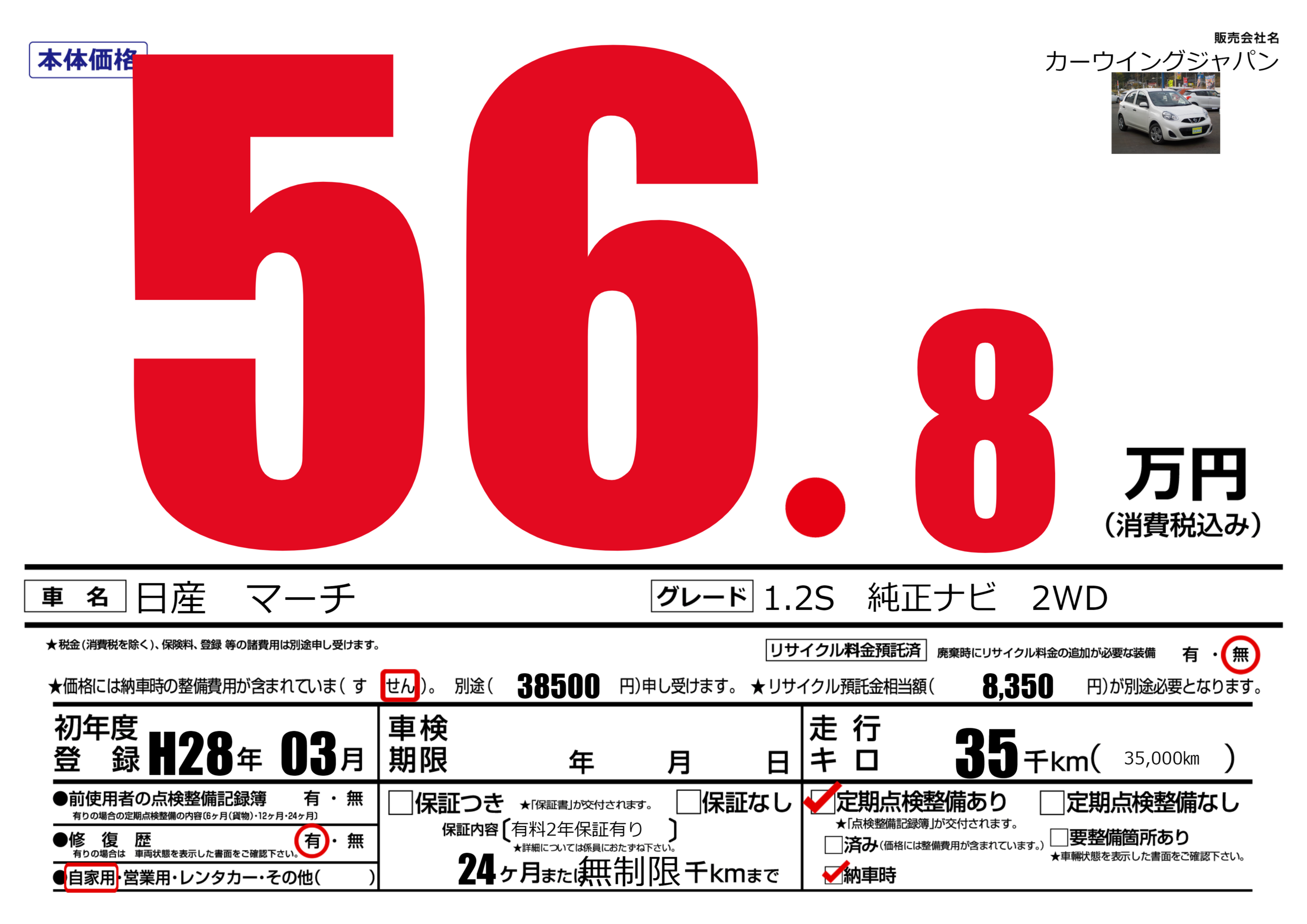 | 車名 | 日産 マーチ | グレード ミッション 排気量 |