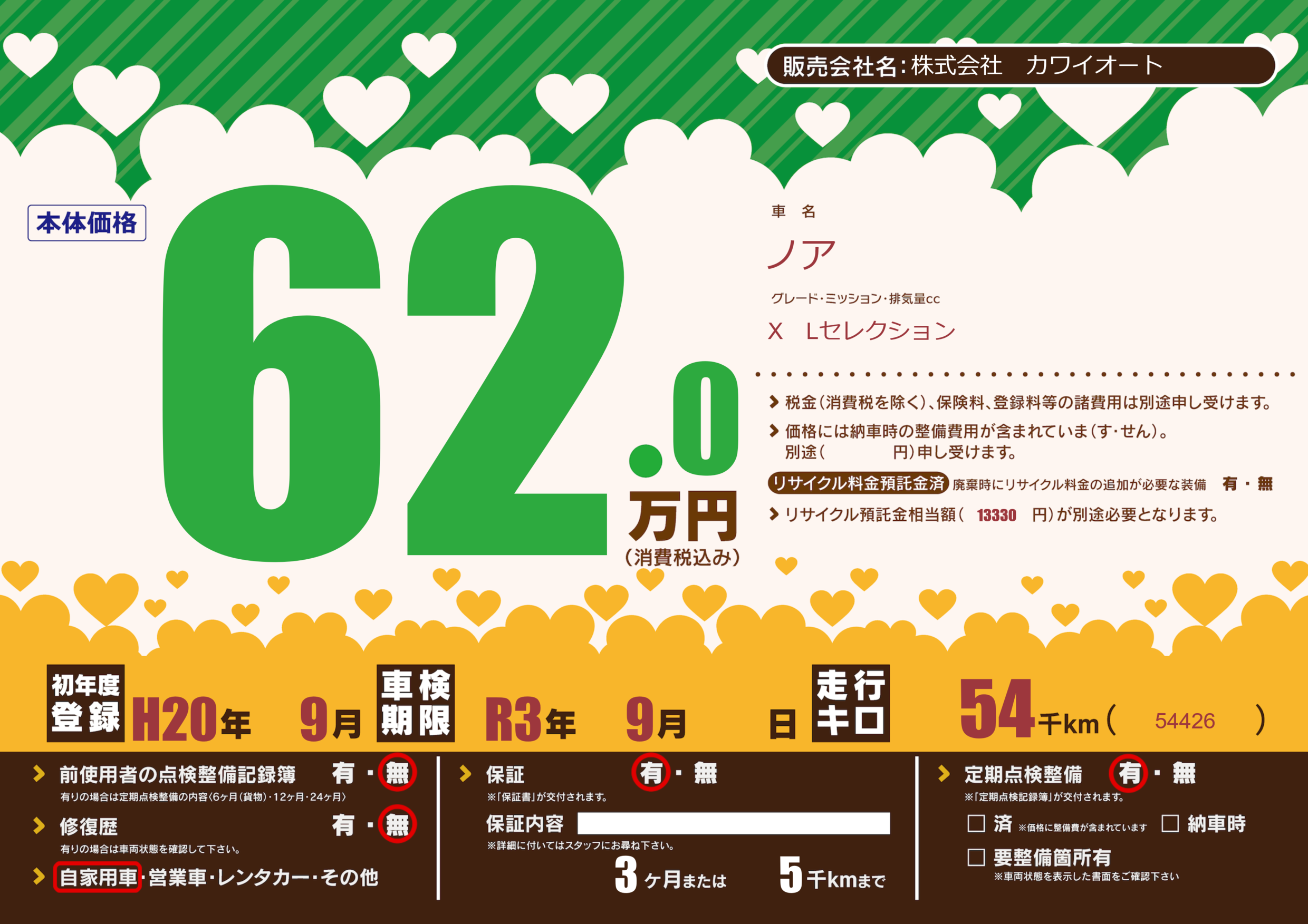 | 走行キロ | 5.4万km | 初年度登録 | H20年9月 |