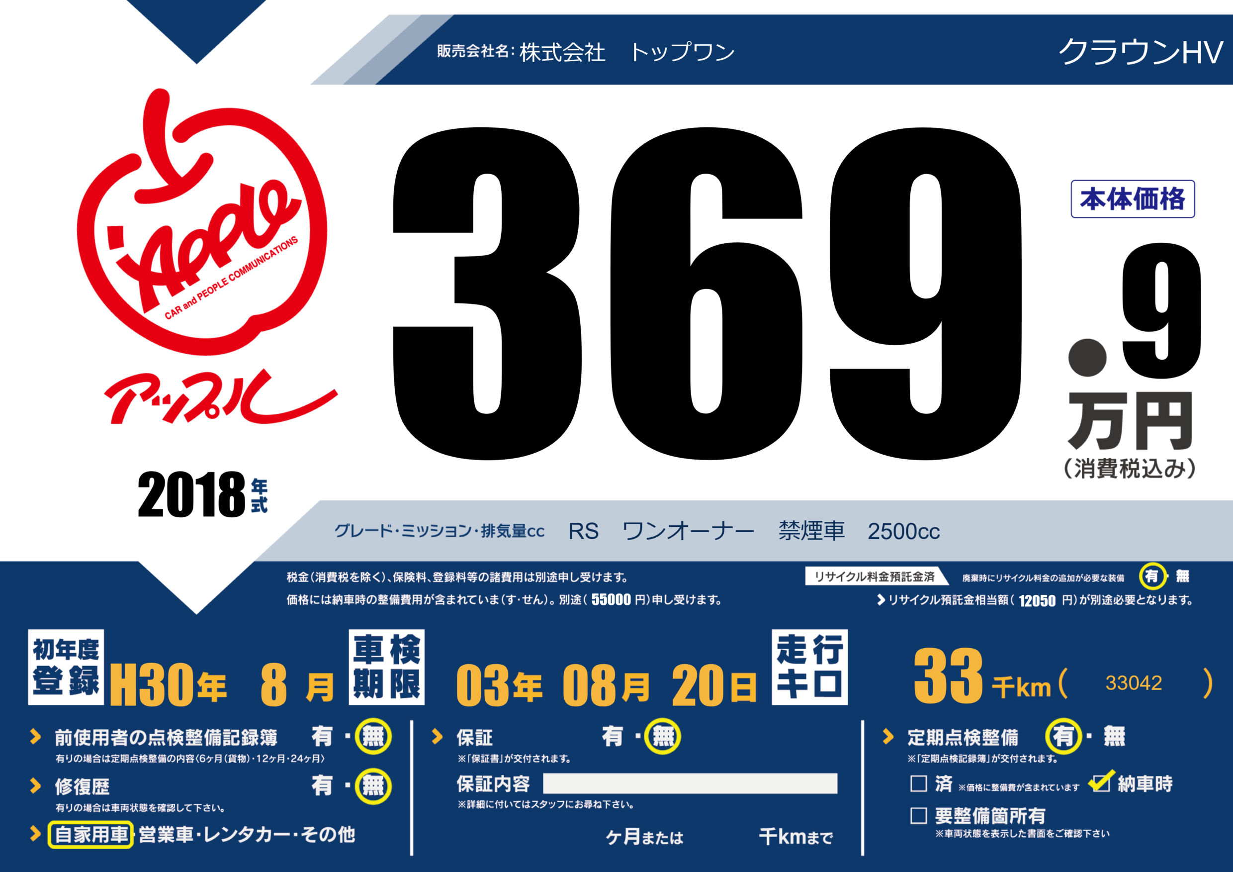 | 車名 | クラウンHV | グレード ミッション 排気量 |