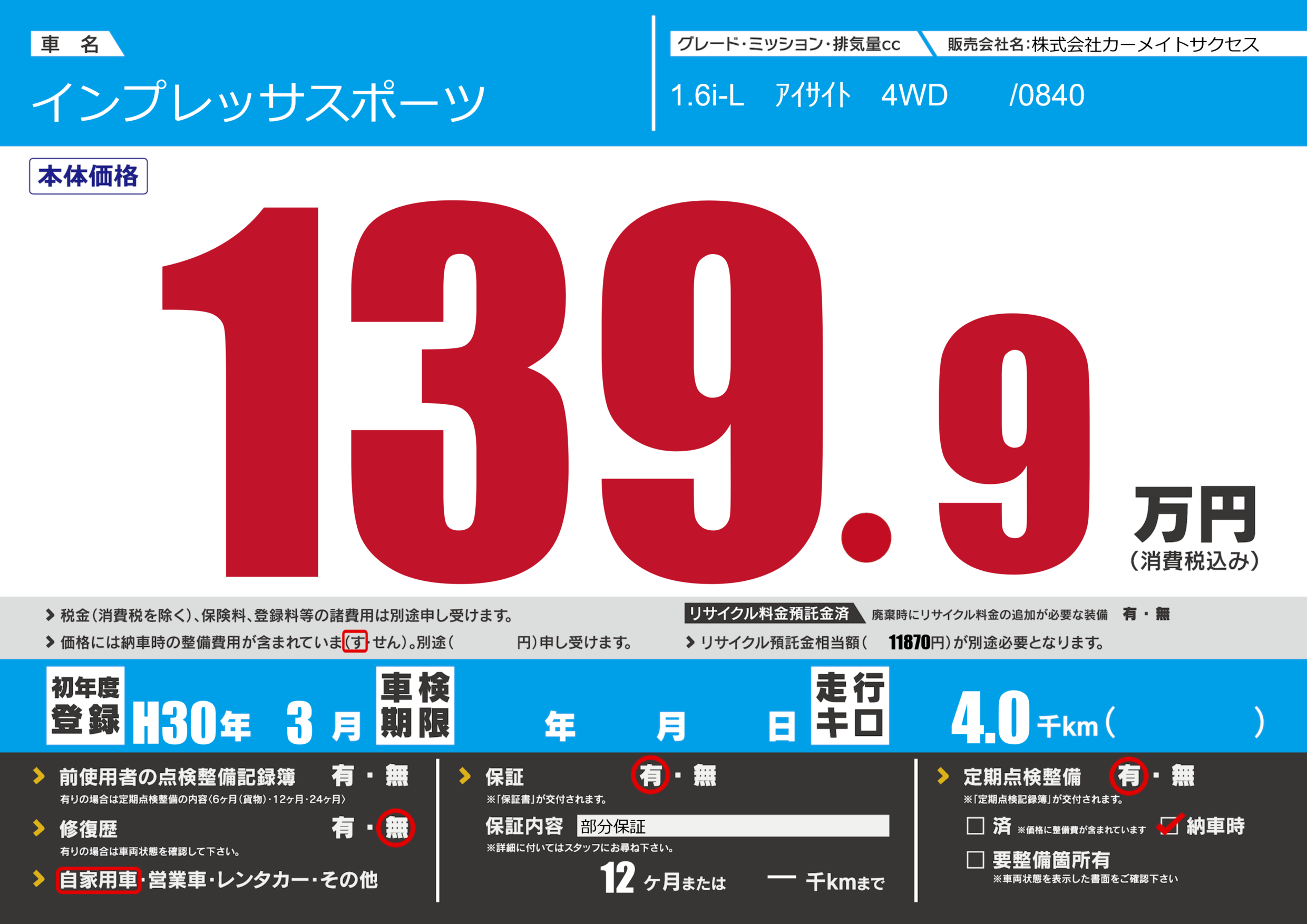 | 車名 | インプレッサスポーツ | グレード ミッション 排気量 |
