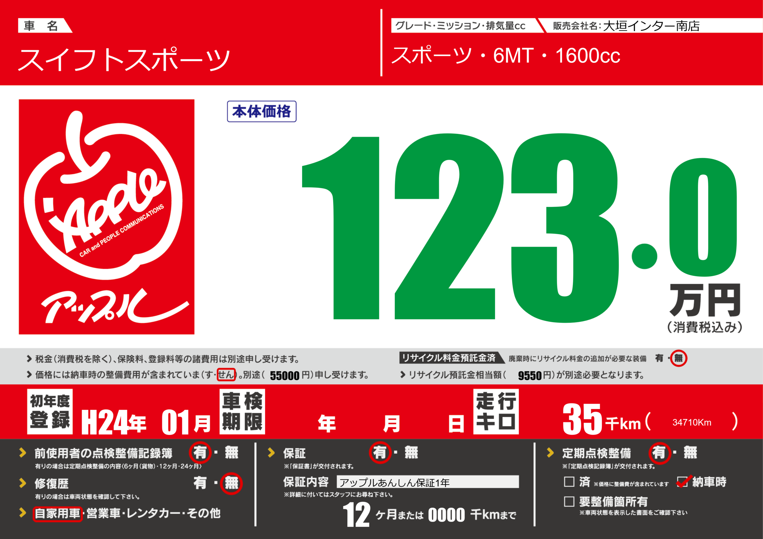 保証付き 保証内容(アップルあんしん保証1年) 12ヶ月または(0000)千kmまで |