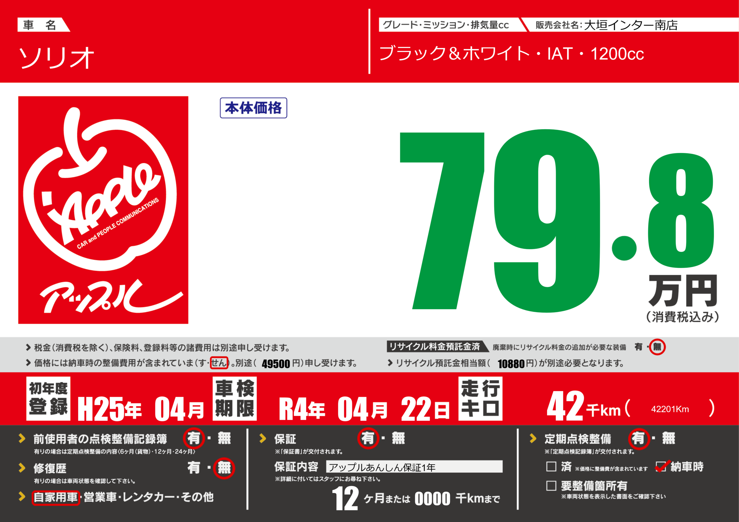 | 車名 | ソリオ | グレード ミッション 排気量 |