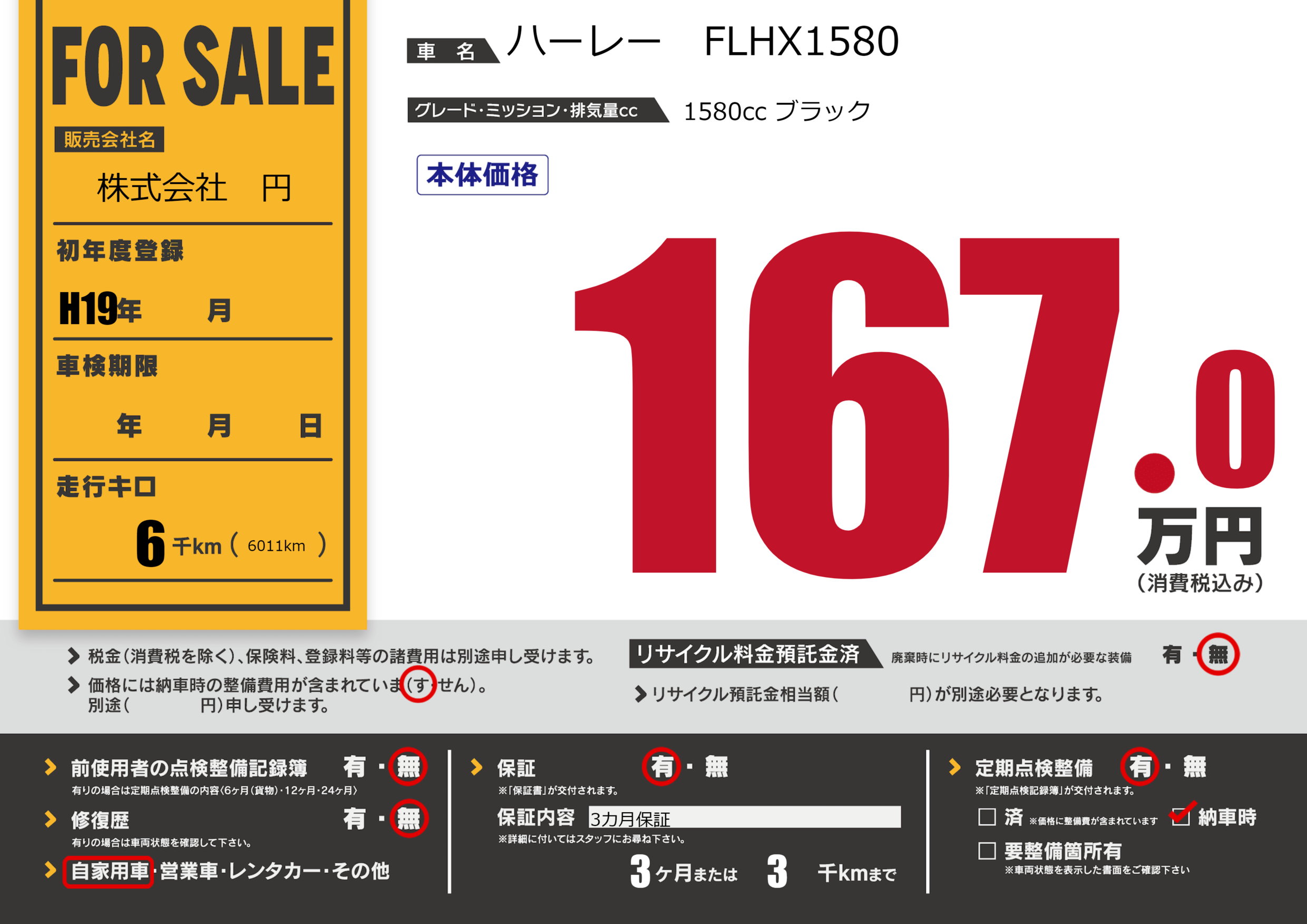 | 車名 | ハーレー FLHX1580 | グレード ミッション 排気量 |