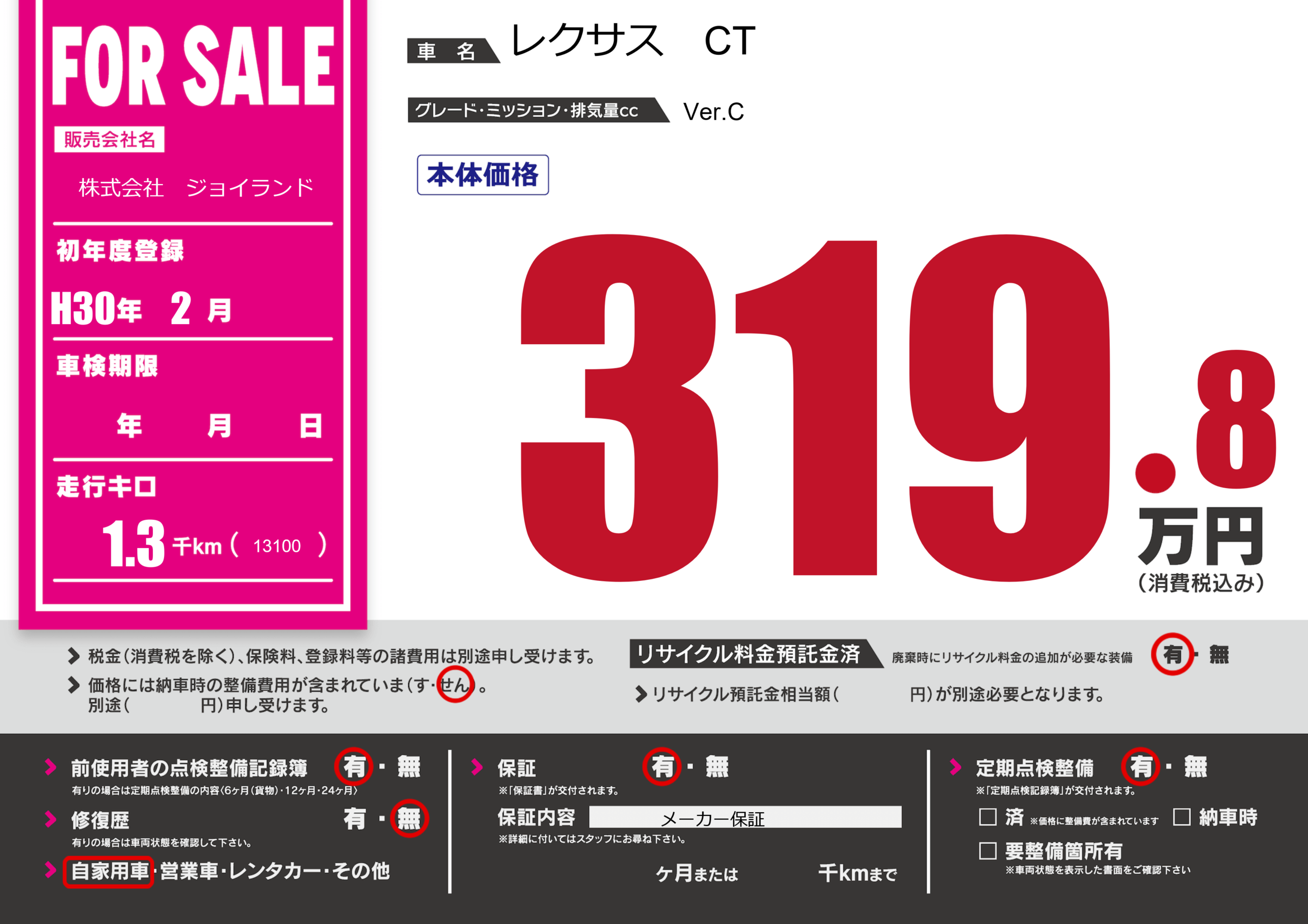 保証付き 保証内容( メーカー保証) ---ヶ月または()千kmまで |