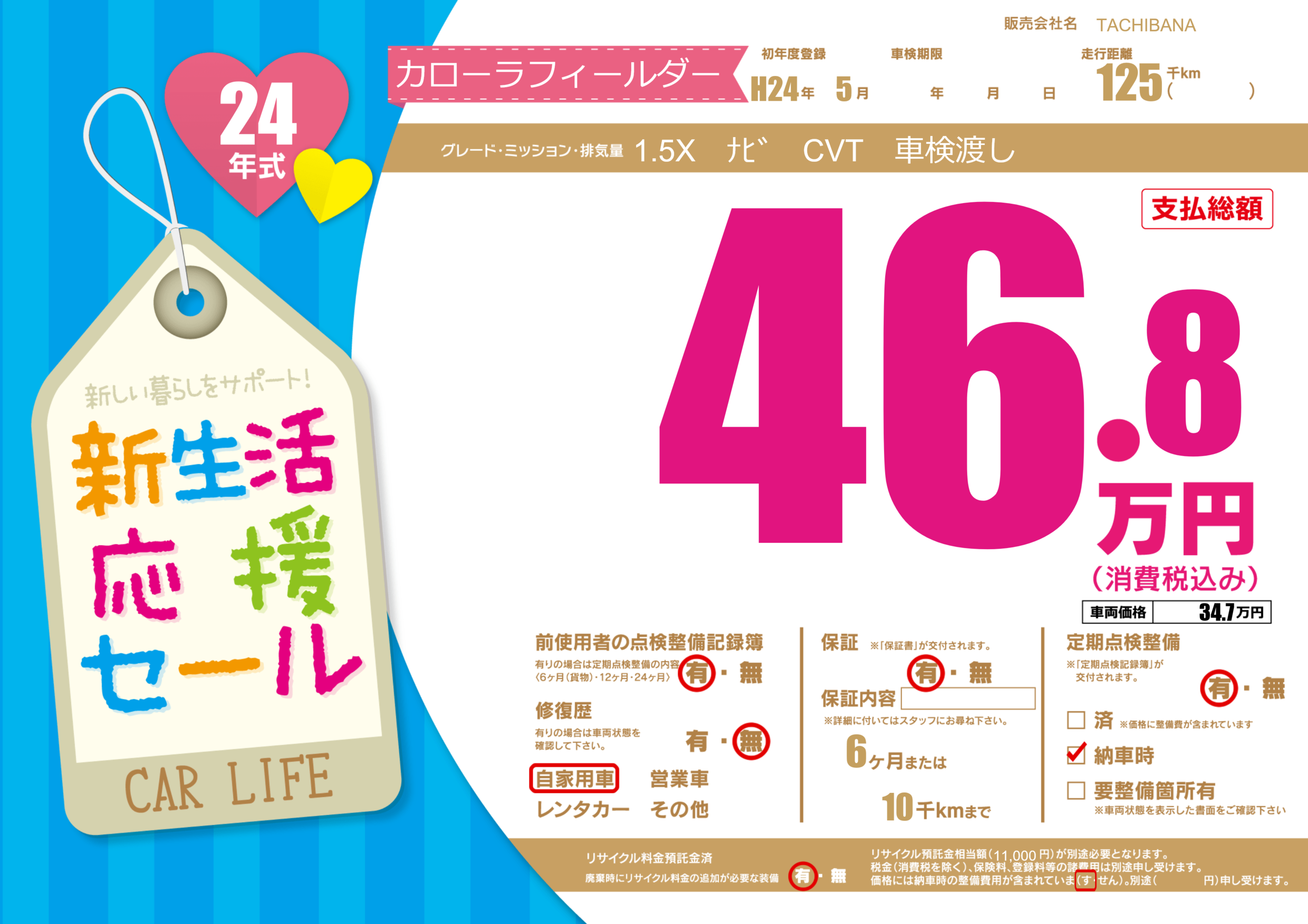 | 定期点検整備 | 定期点検整備あり 納車時あり | ||