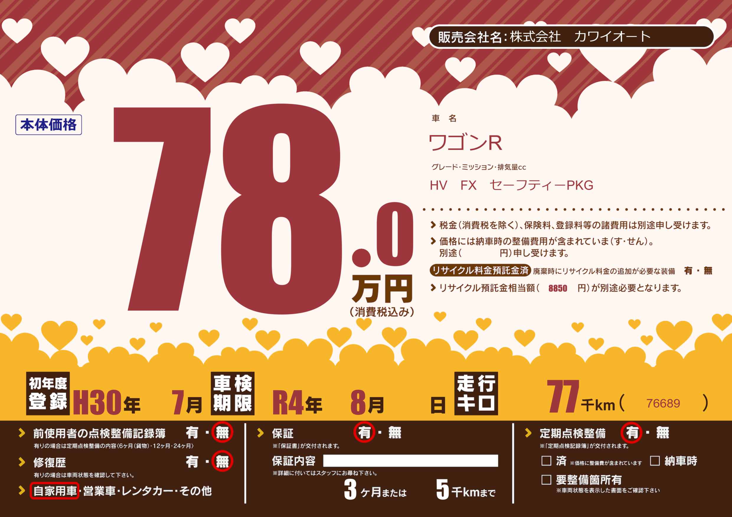 | 走行キロ | 7.7万km | 初年度登録 | H30年7月 |