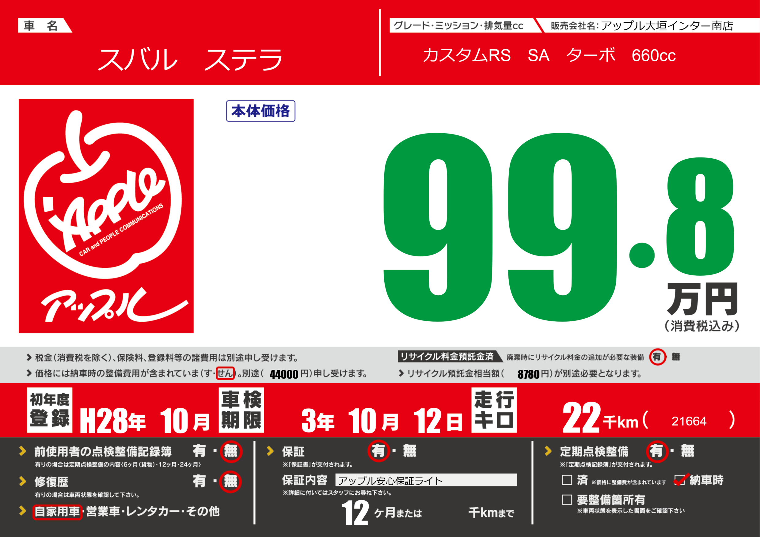 | 車名 | スバル ステラ | グレード ミッション 排気量 |