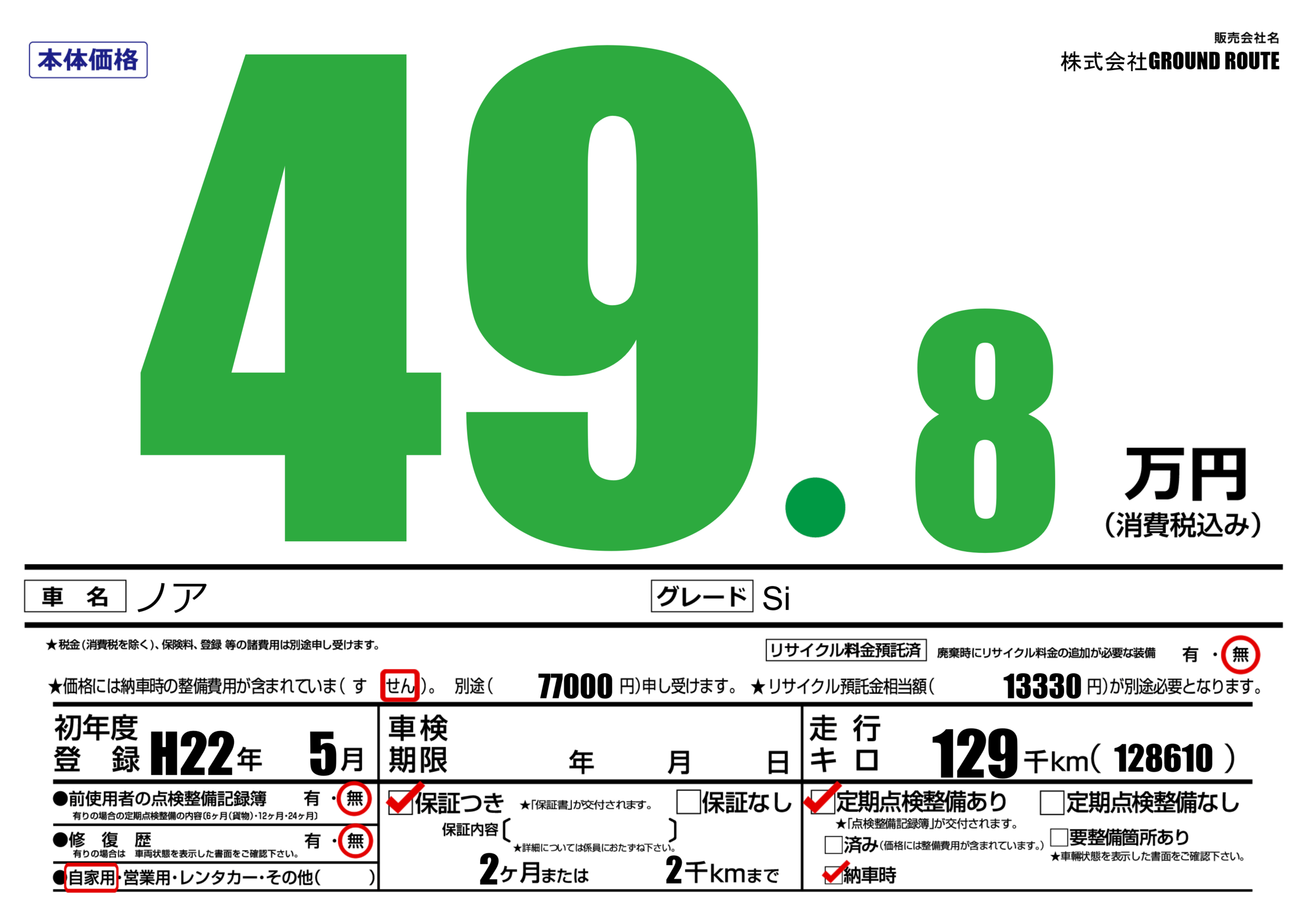 | 走行キロ | 12.9万km | 初年度登録 | H22年5月 |