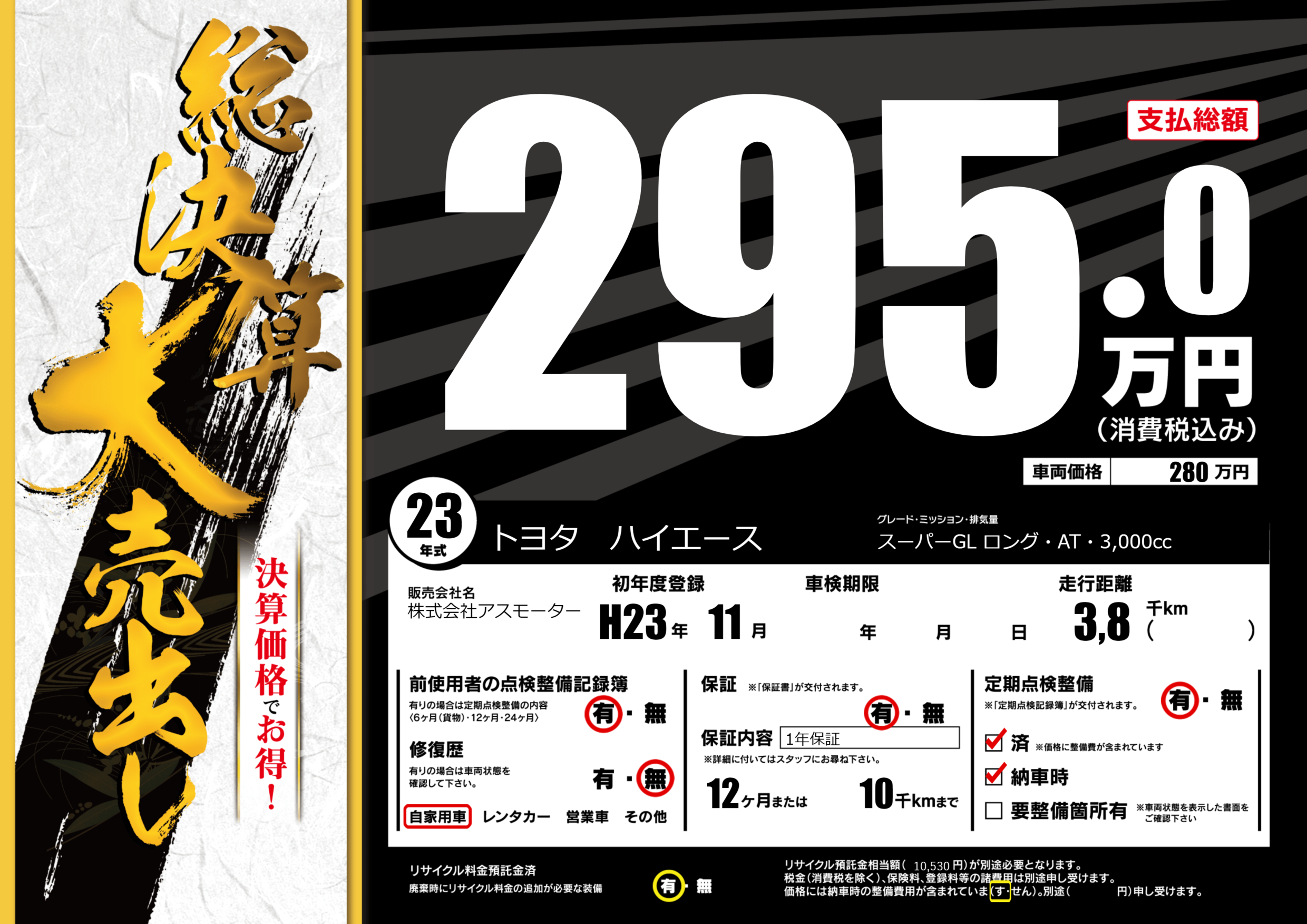| 車名 | トヨタ ハイエース | グレード ミッション 排気量 |