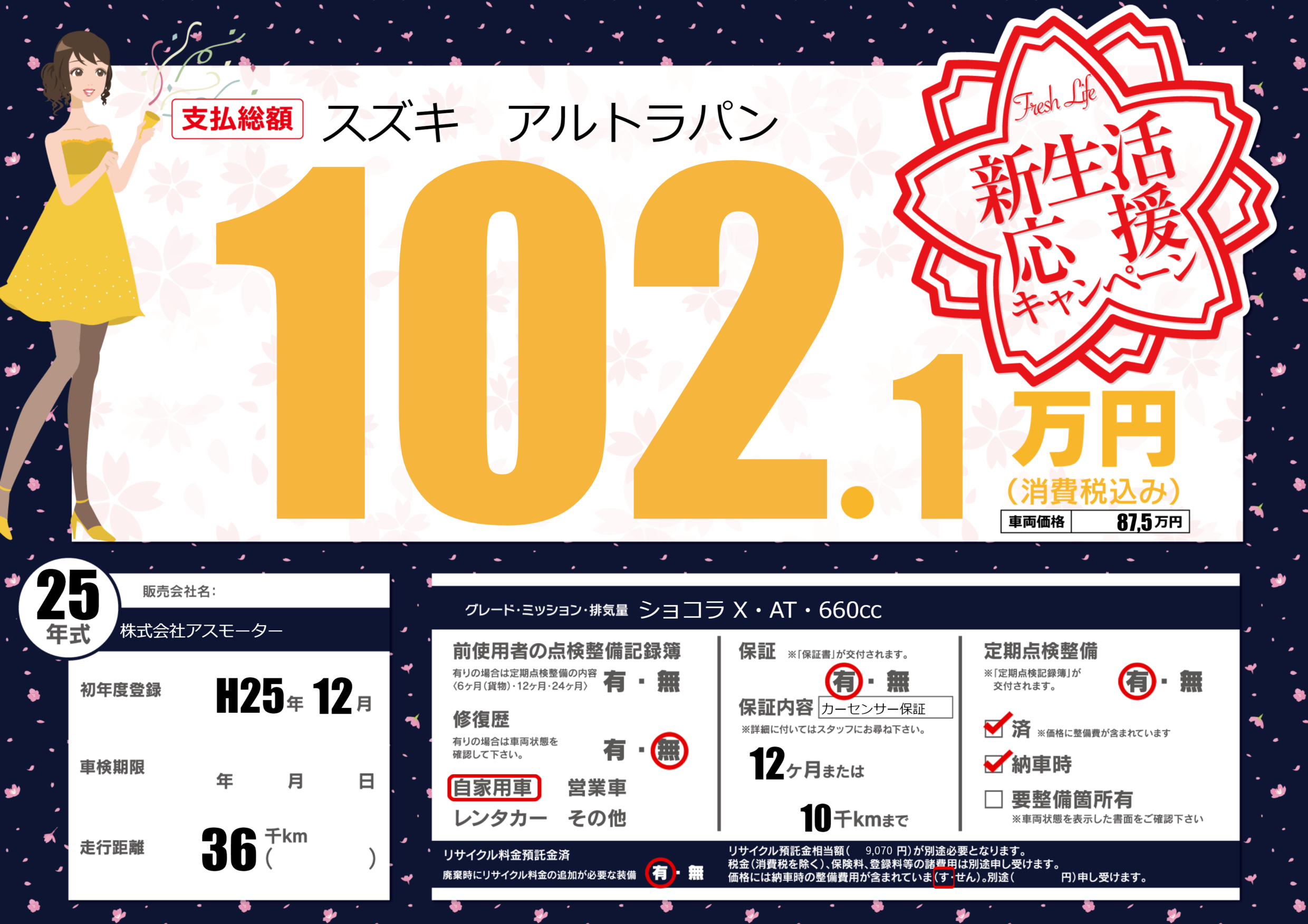 | 定期点検整備 | 定期点検整備あり 定期点検整備済み 納車時あり | ||