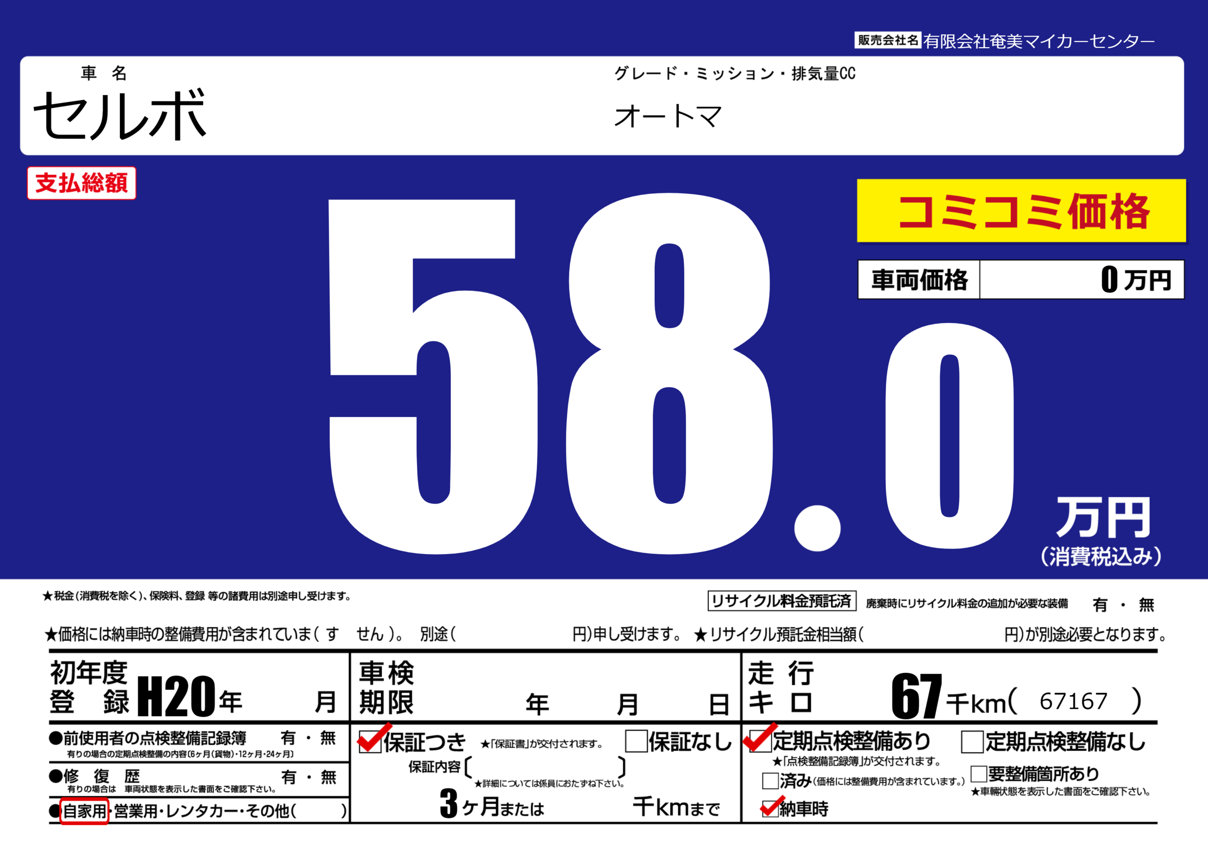 | 車名 | セルボ | グレード ミッション 排気量 |