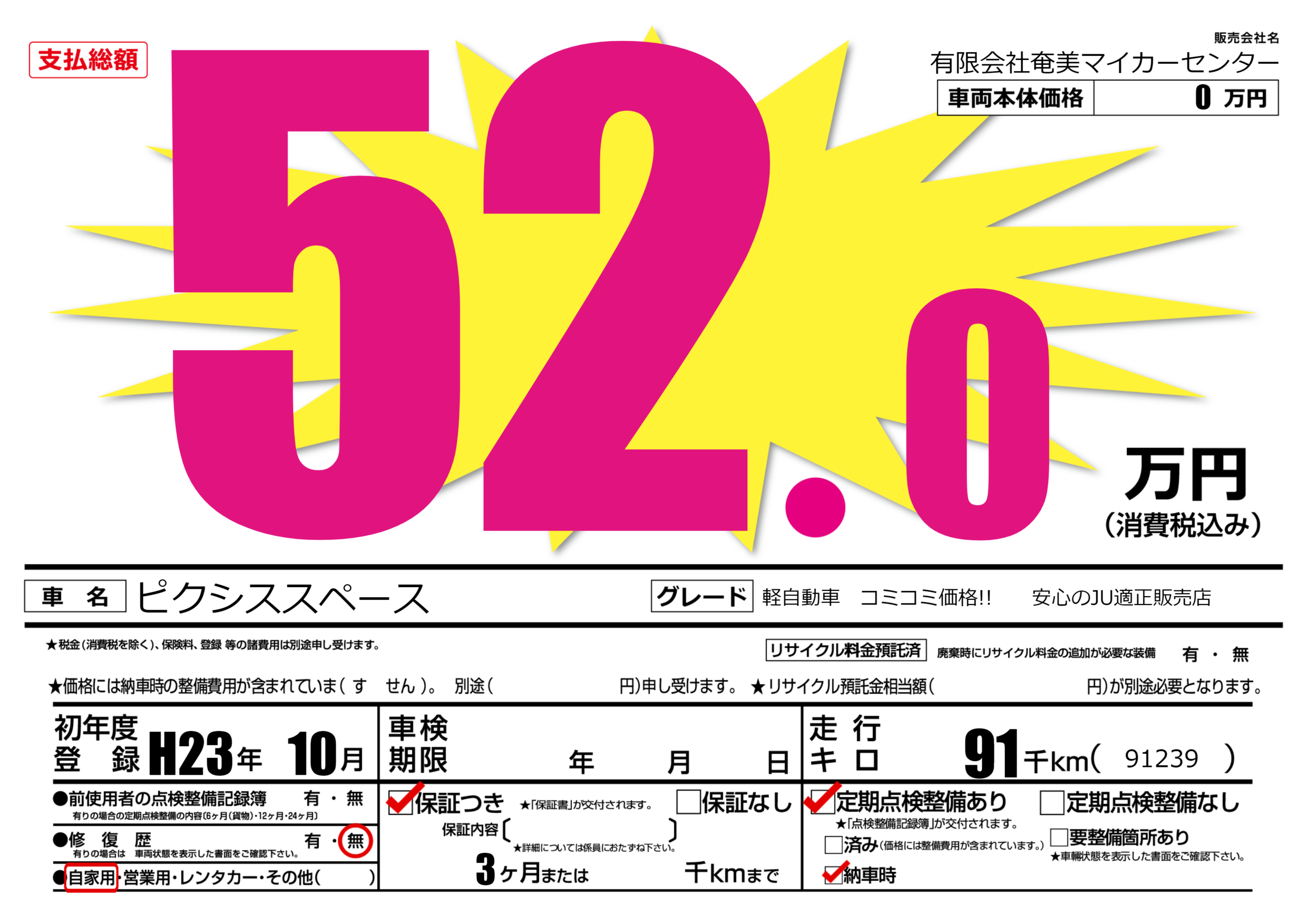 | 走行キロ | 9.1万km | 初年度登録 | H23年10月 |