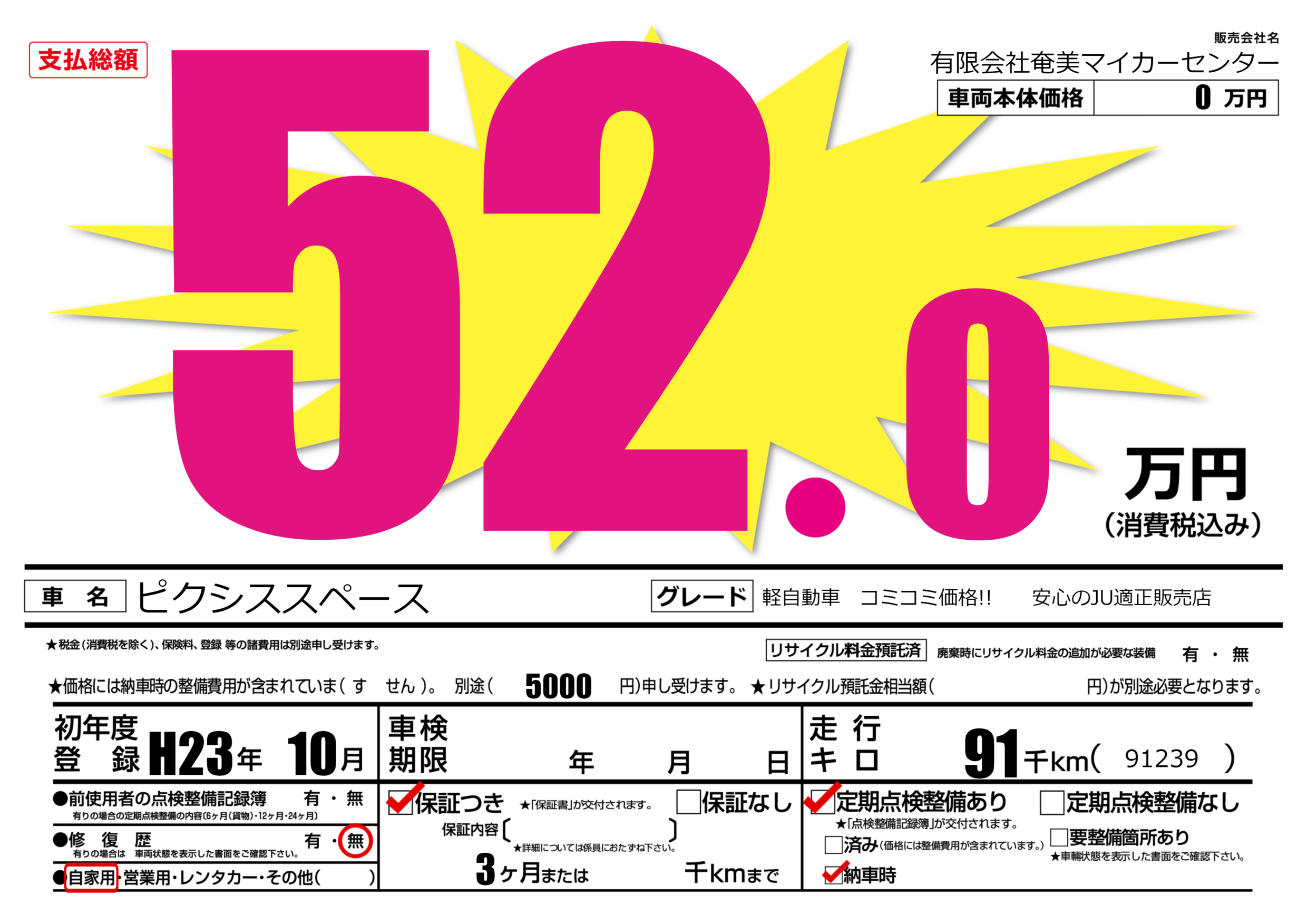 | 走行キロ | 9.1万km | 初年度登録 | H23年10月 |