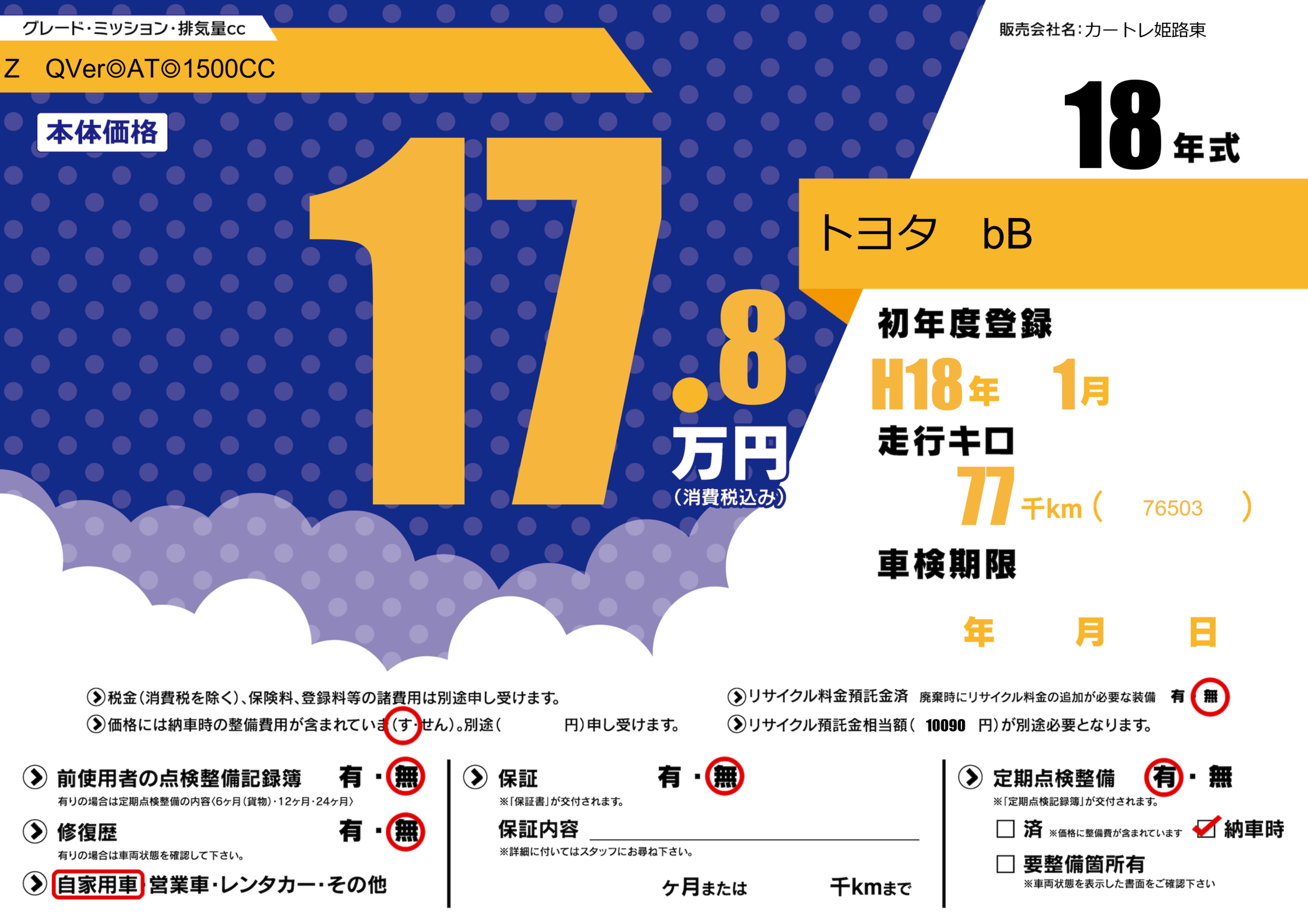 | 車名 | トヨタ bB | グレード ミッション 排気量 |