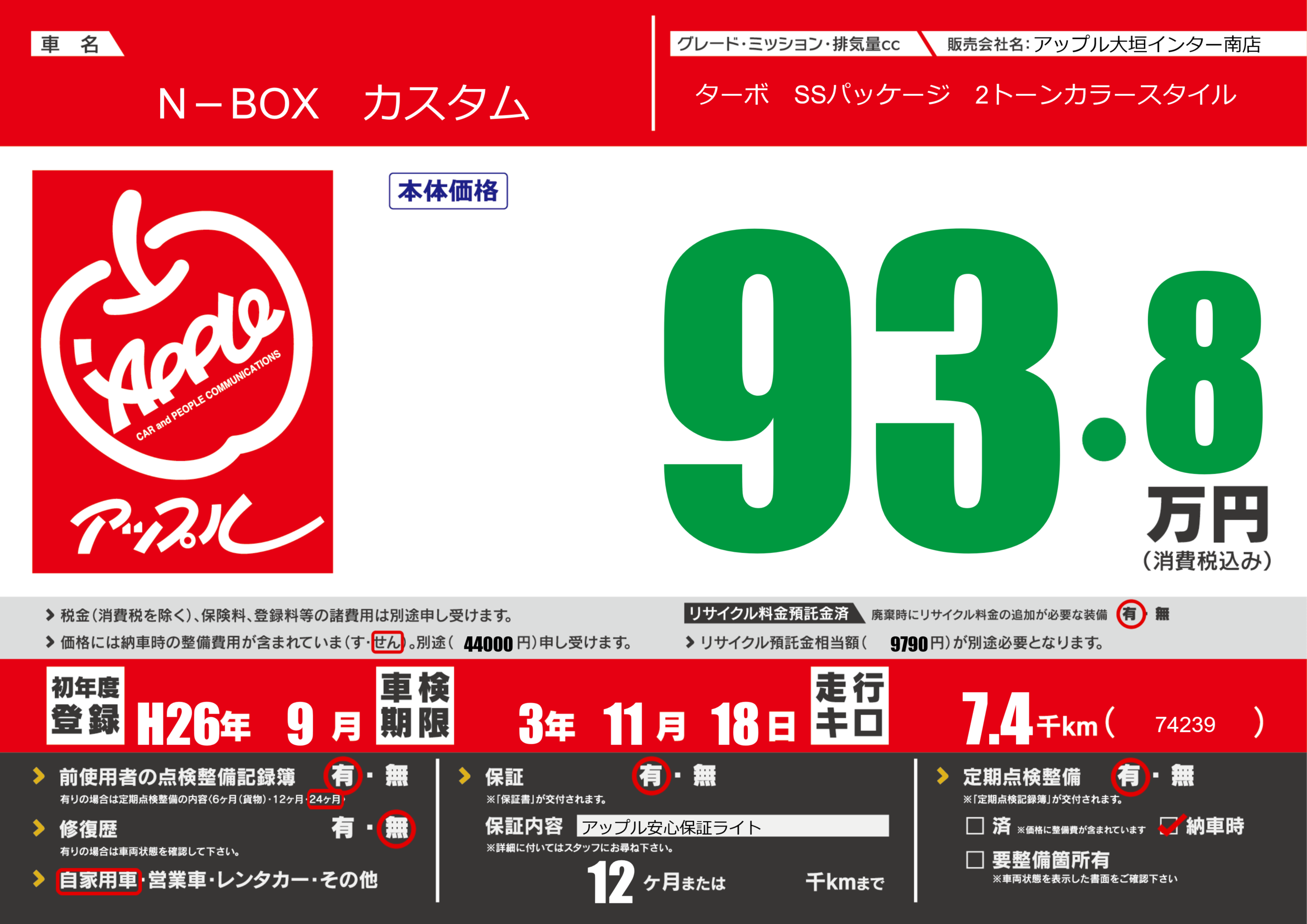 保証付き 保証内容(アップル安心保証ライト) 12ヶ月または()千kmまで |