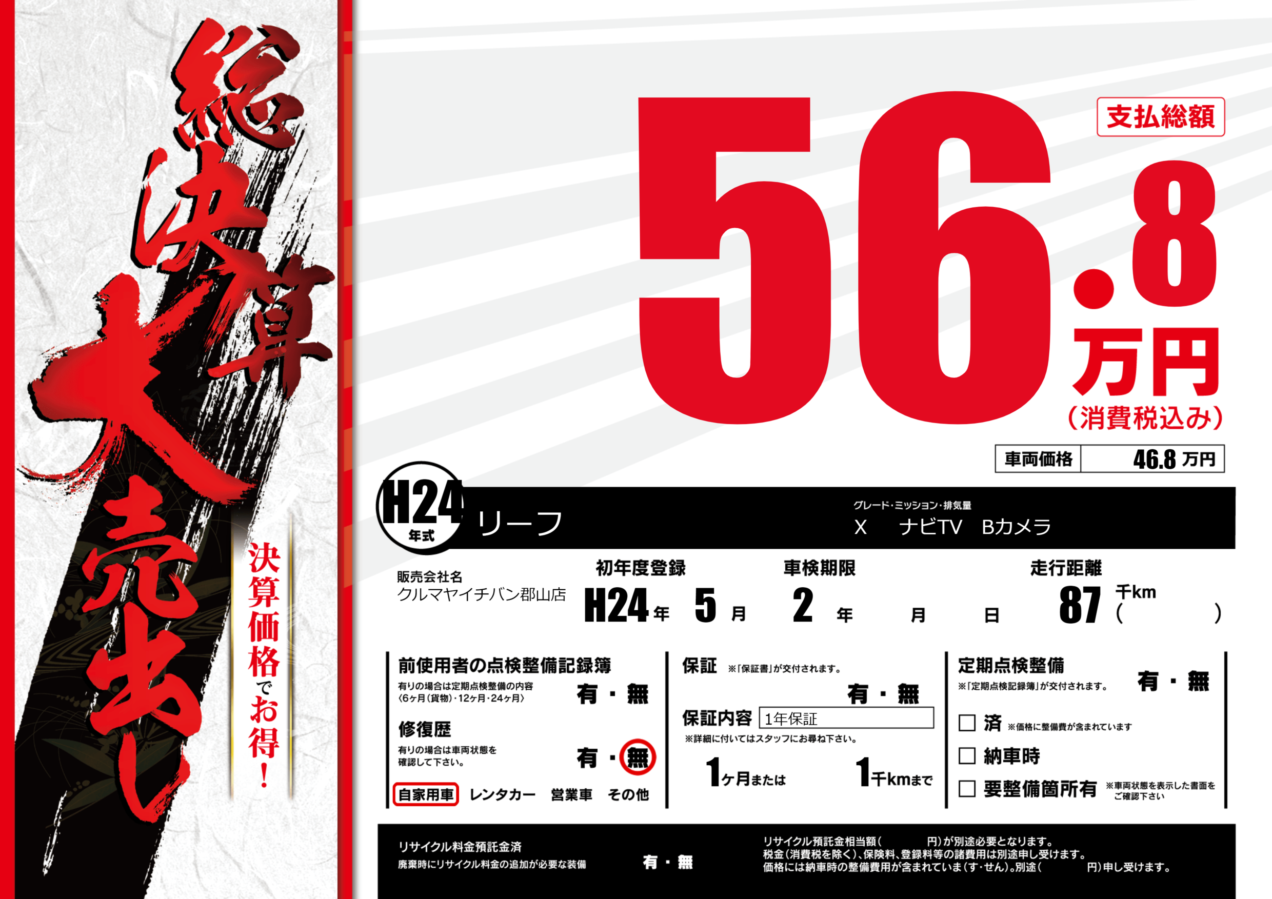 | 走行キロ | 8.7万km | 初年度登録 | H24年5月 |