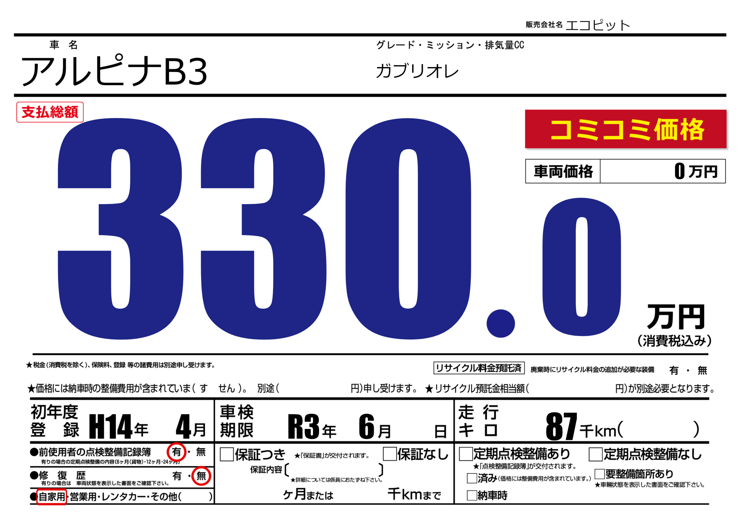 | 車名 | アルピナB3 | グレード ミッション 排気量 |