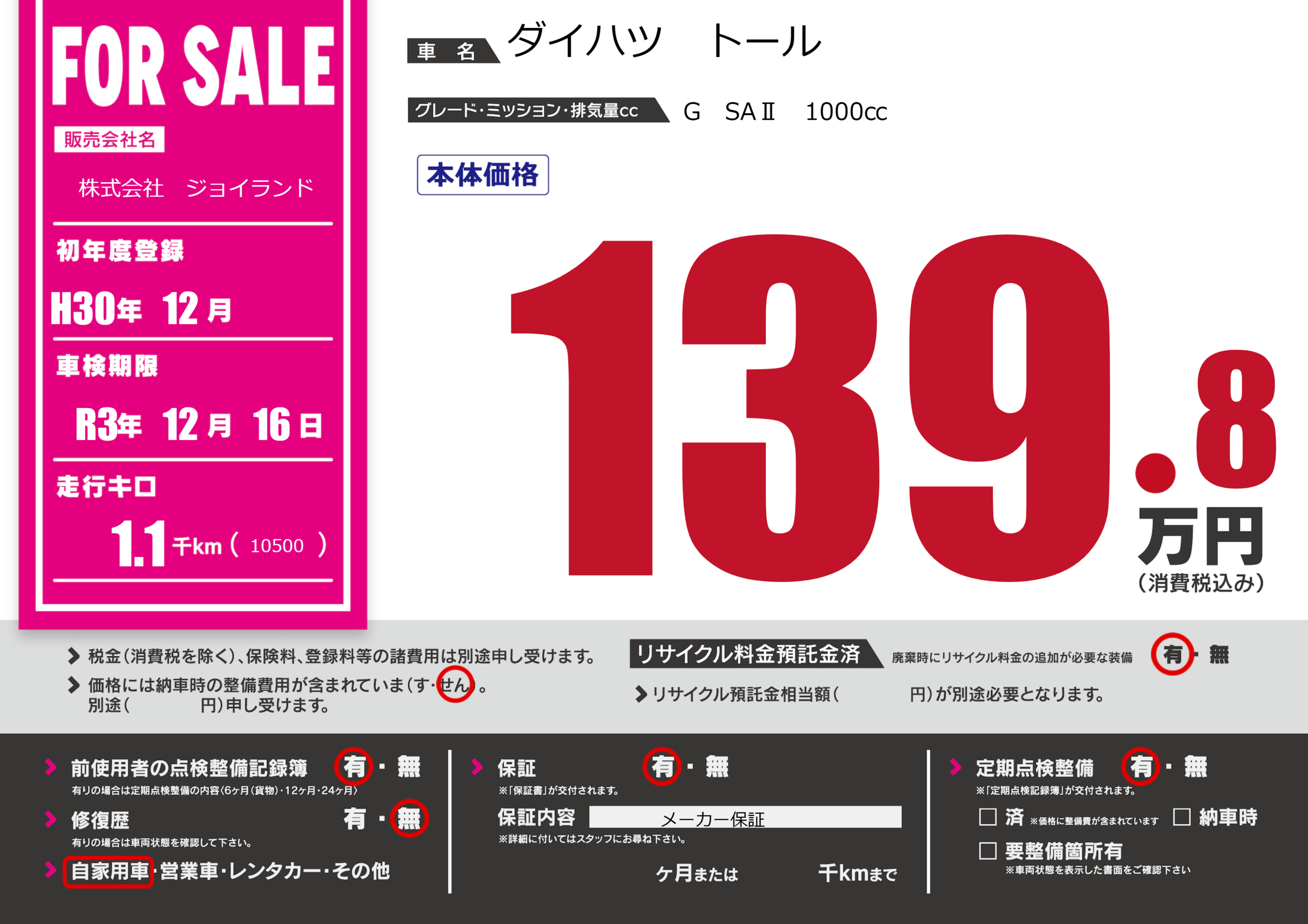 | 車名 | ダイハツ トール | グレード ミッション 排気量 |
