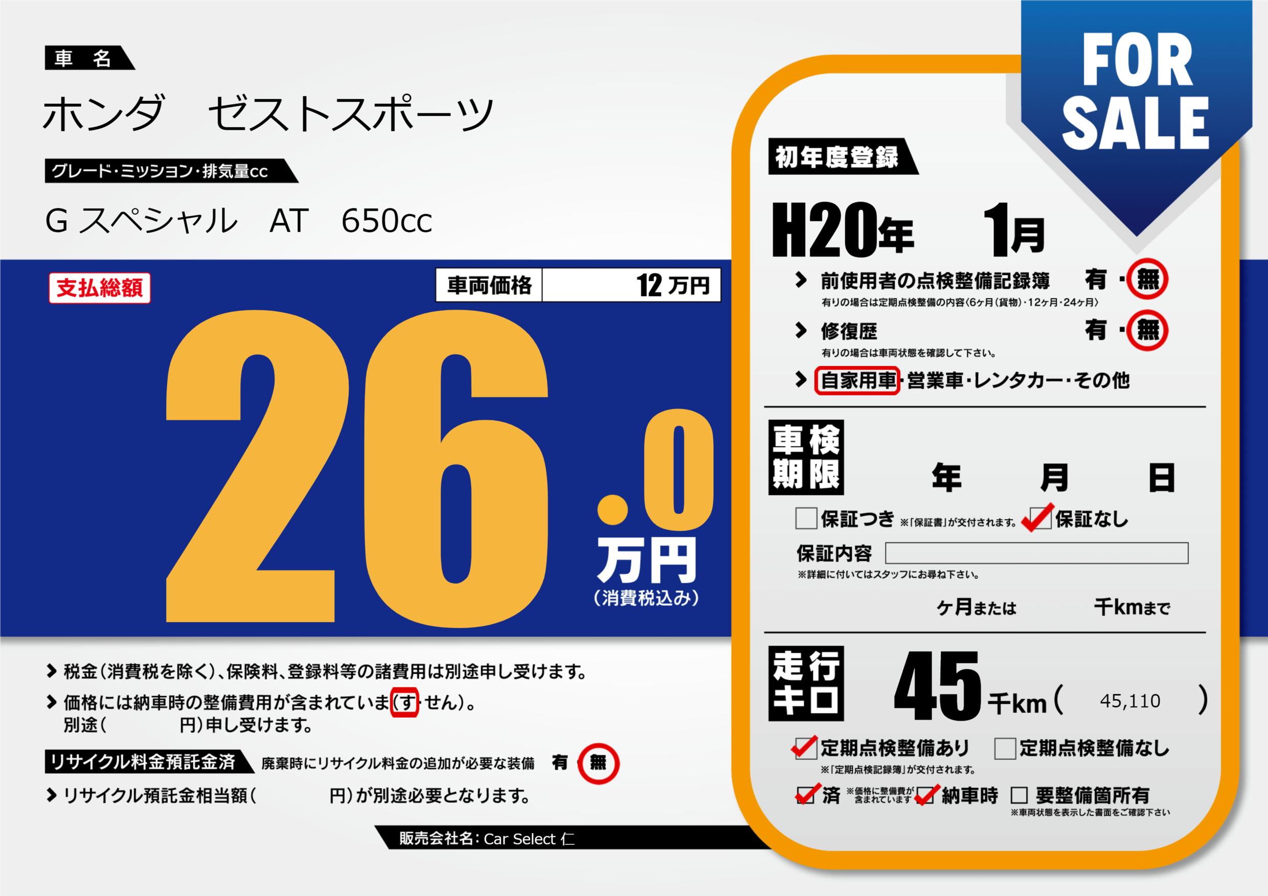 | 定期点検整備 | 定期点検整備あり 定期点検整備済み 納車時あり | ||