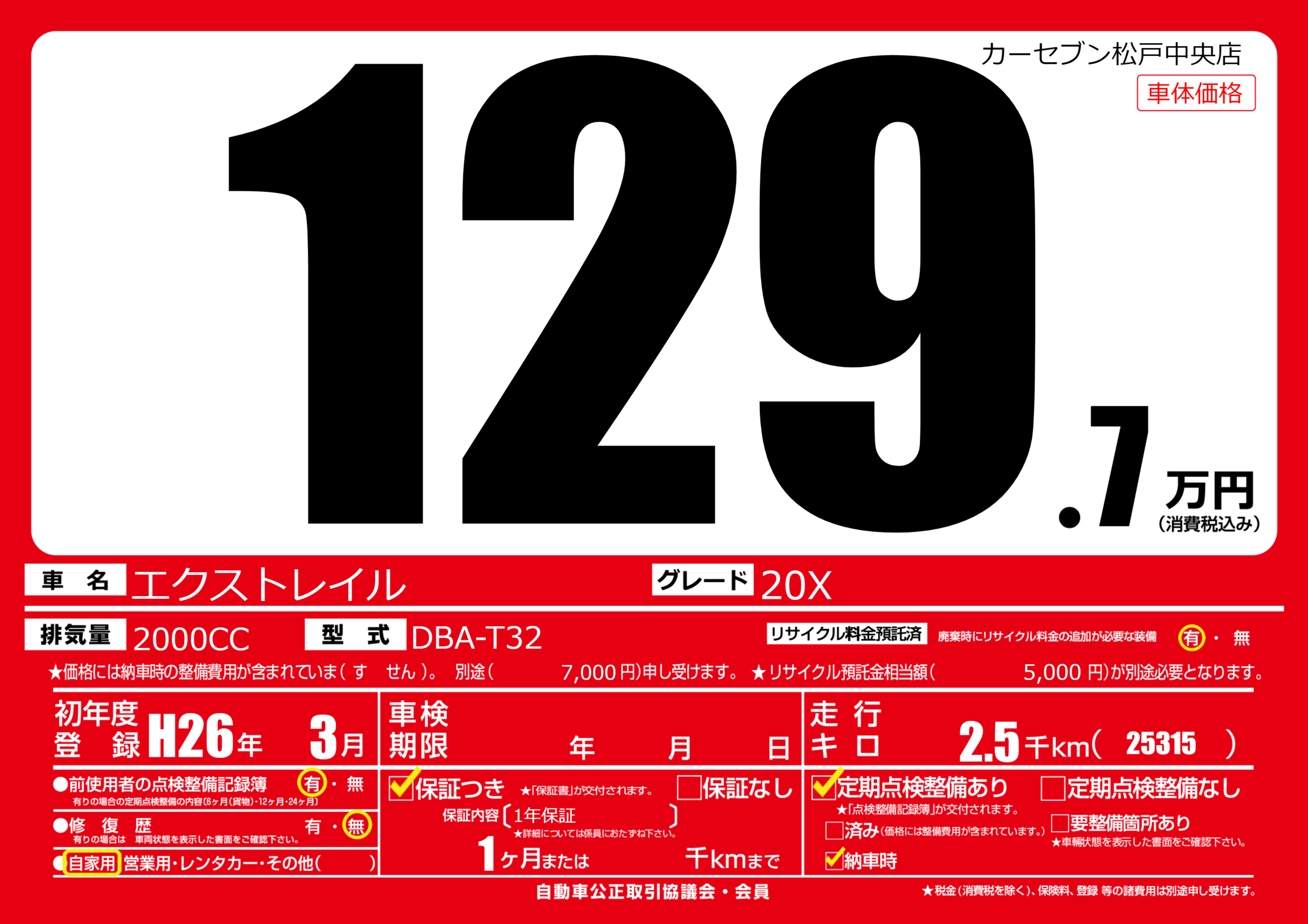 | 車名 | エクストレイル | グレード ミッション 排気量 |