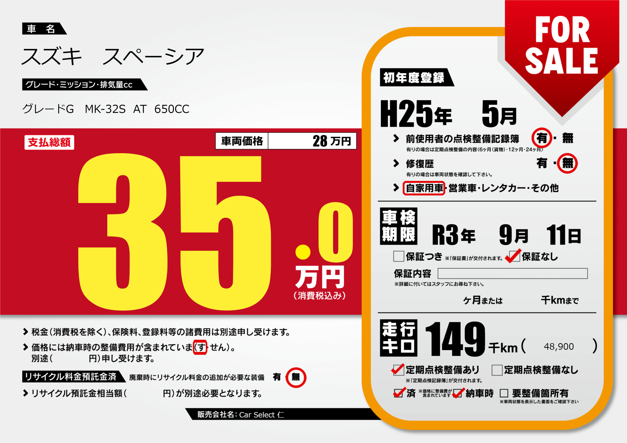 あり | 車検制限 | R3年9月11月 |
