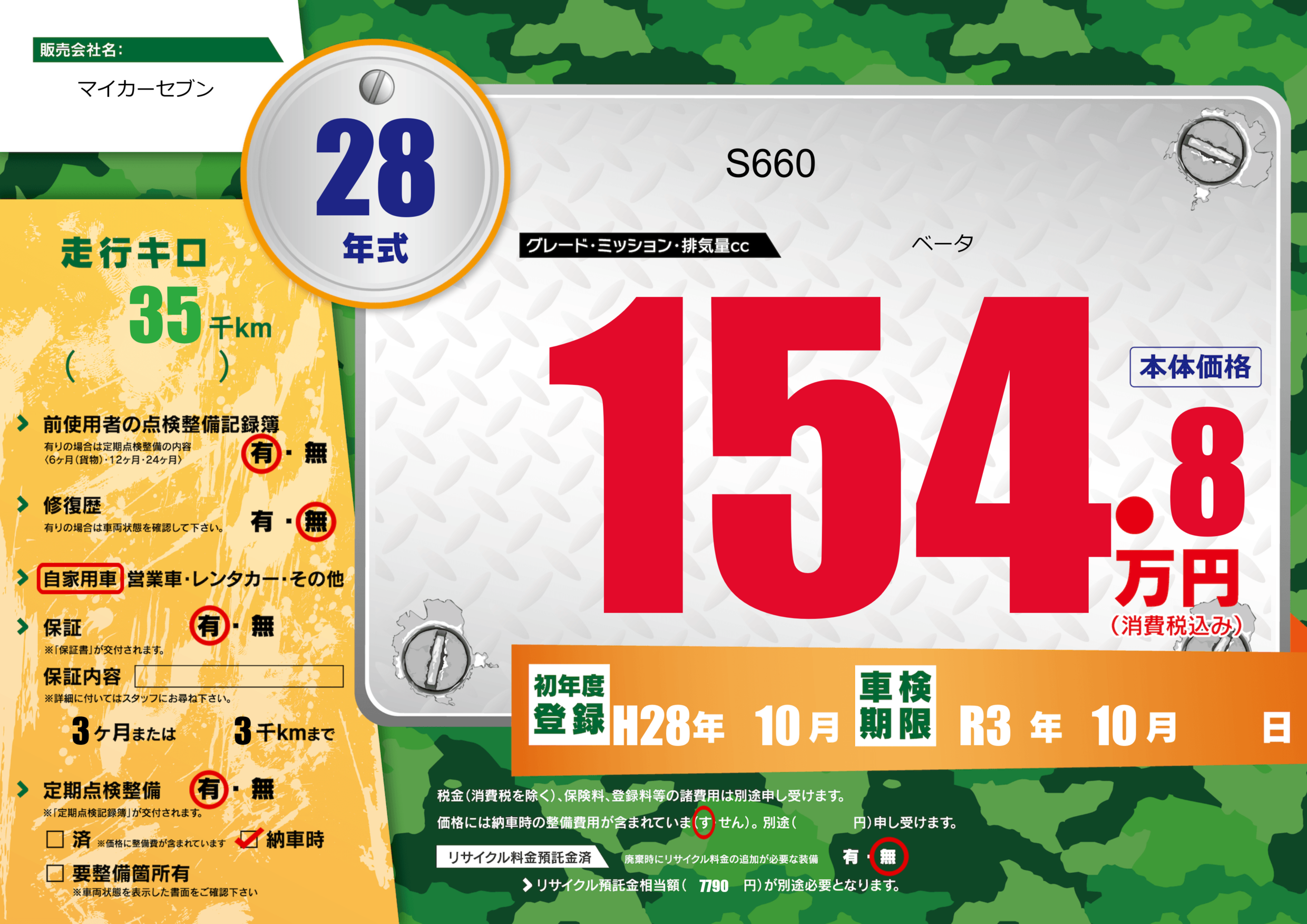 | 車検制限 | R3年 10月 - 日 | ||
