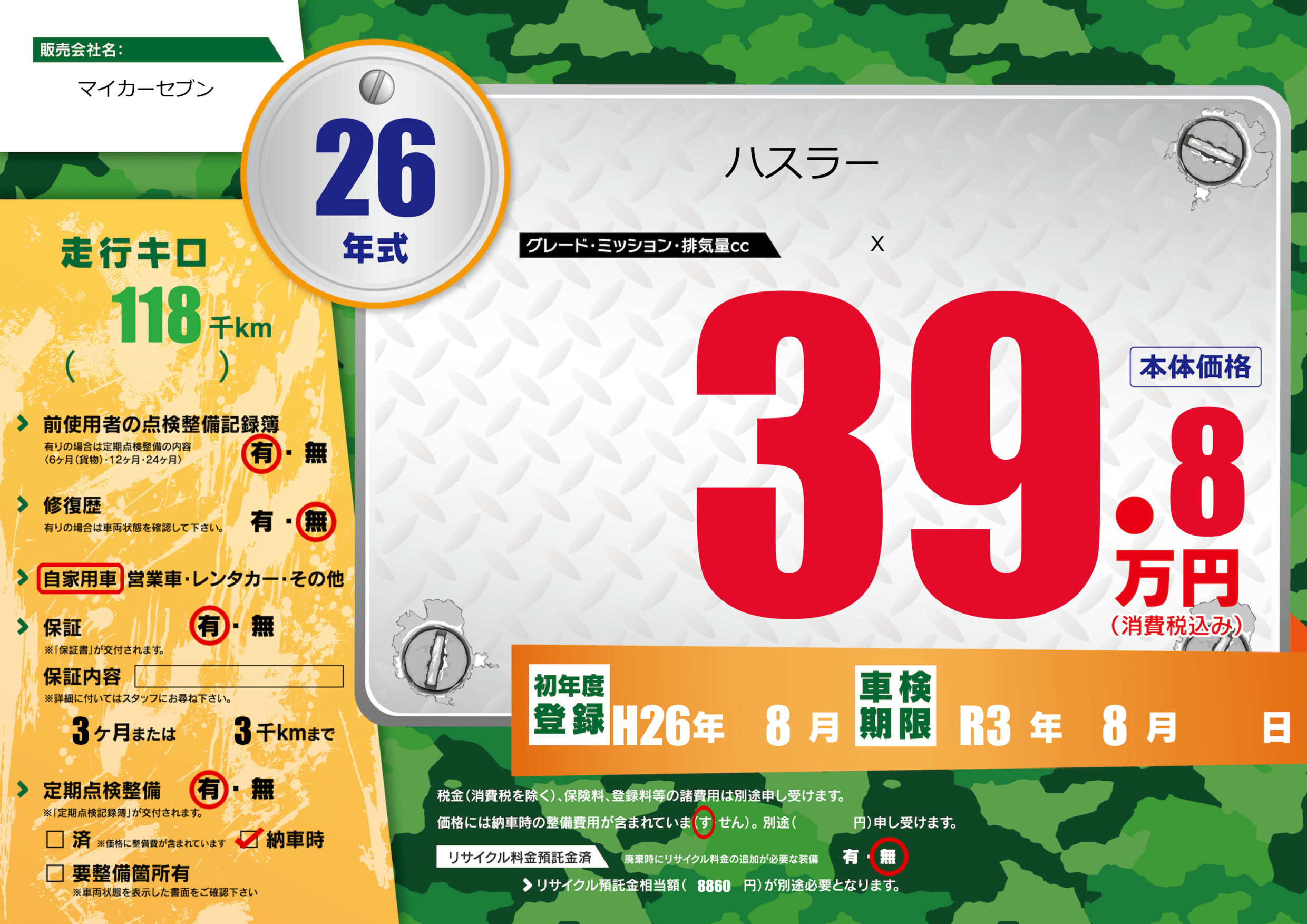 | 車名 | ハスラー | グレード ミッション 排気量 |
