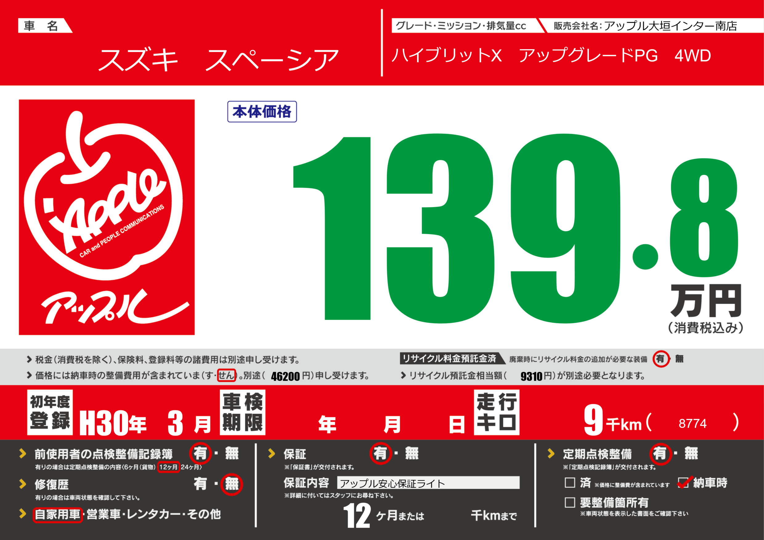保証付き 保証内容(アップル安心保証ライト) 12ヶ月または()千kmまで |