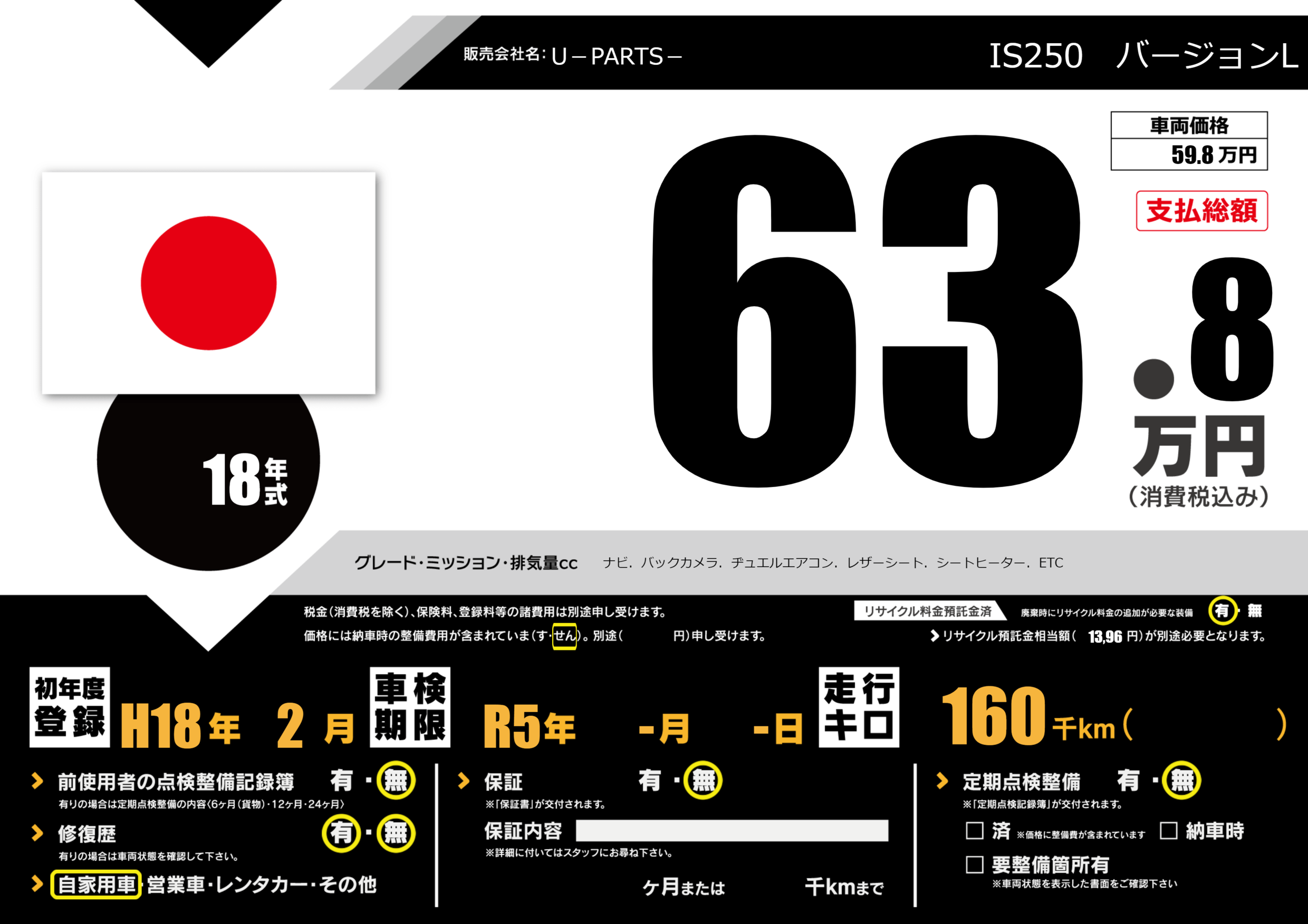 | 走行キロ | 16万km | 初年度登録 | H18年2月 |
