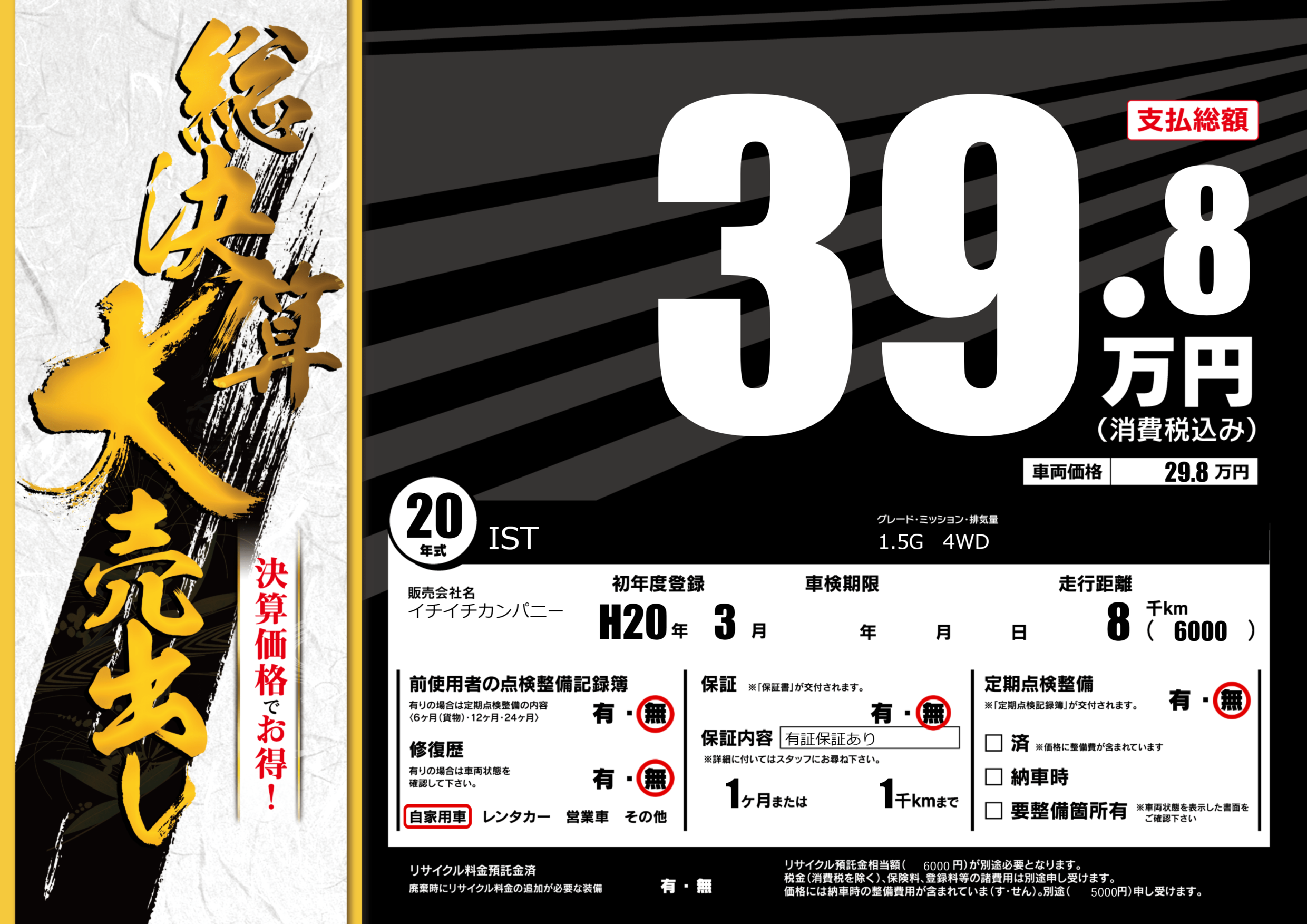 | 走行キロ | 0.8万km | 初年度登録 | H20年3月 |