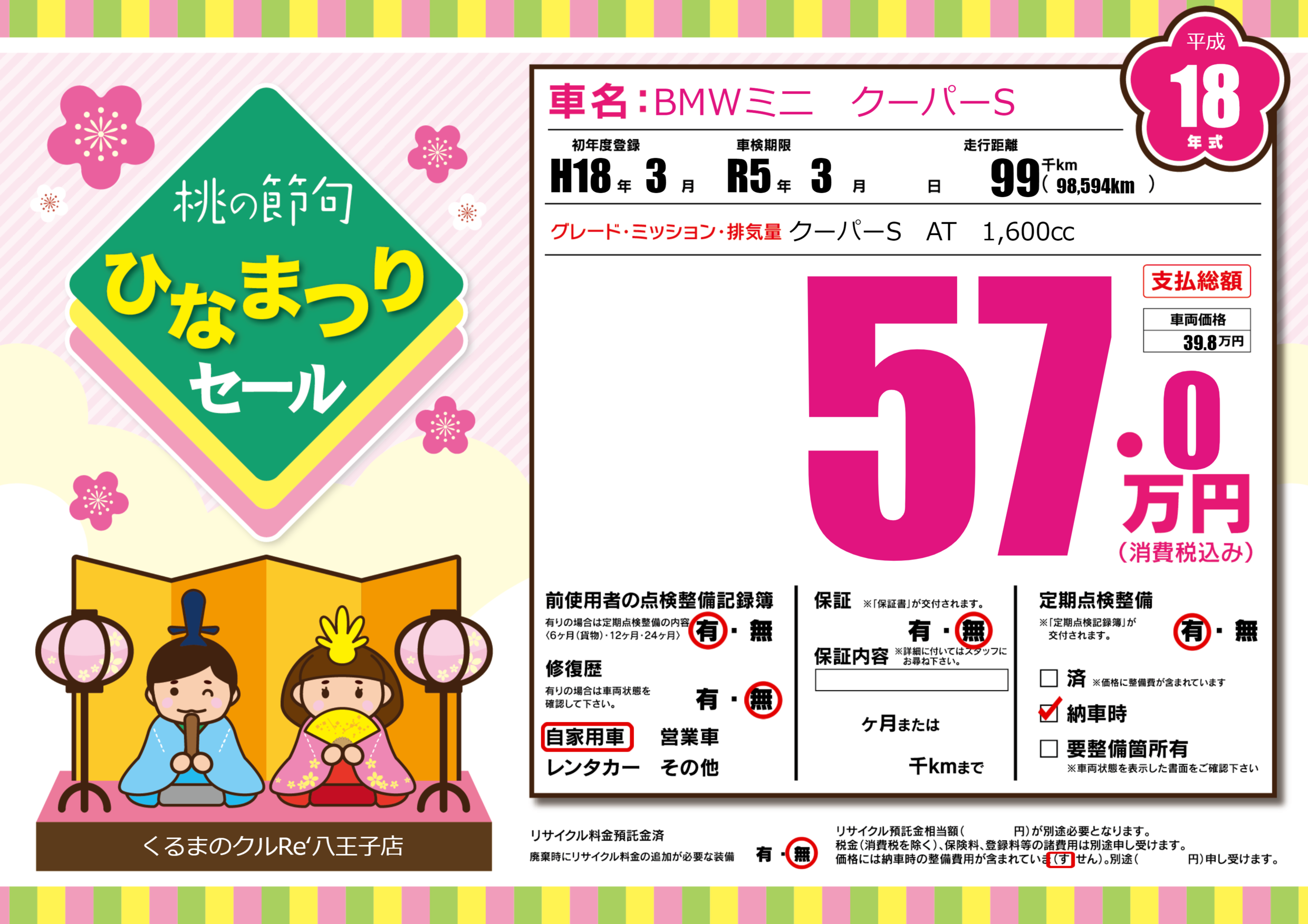 | 車名 | BMWミニ クーパーS | グレード ミッション 排気量 |