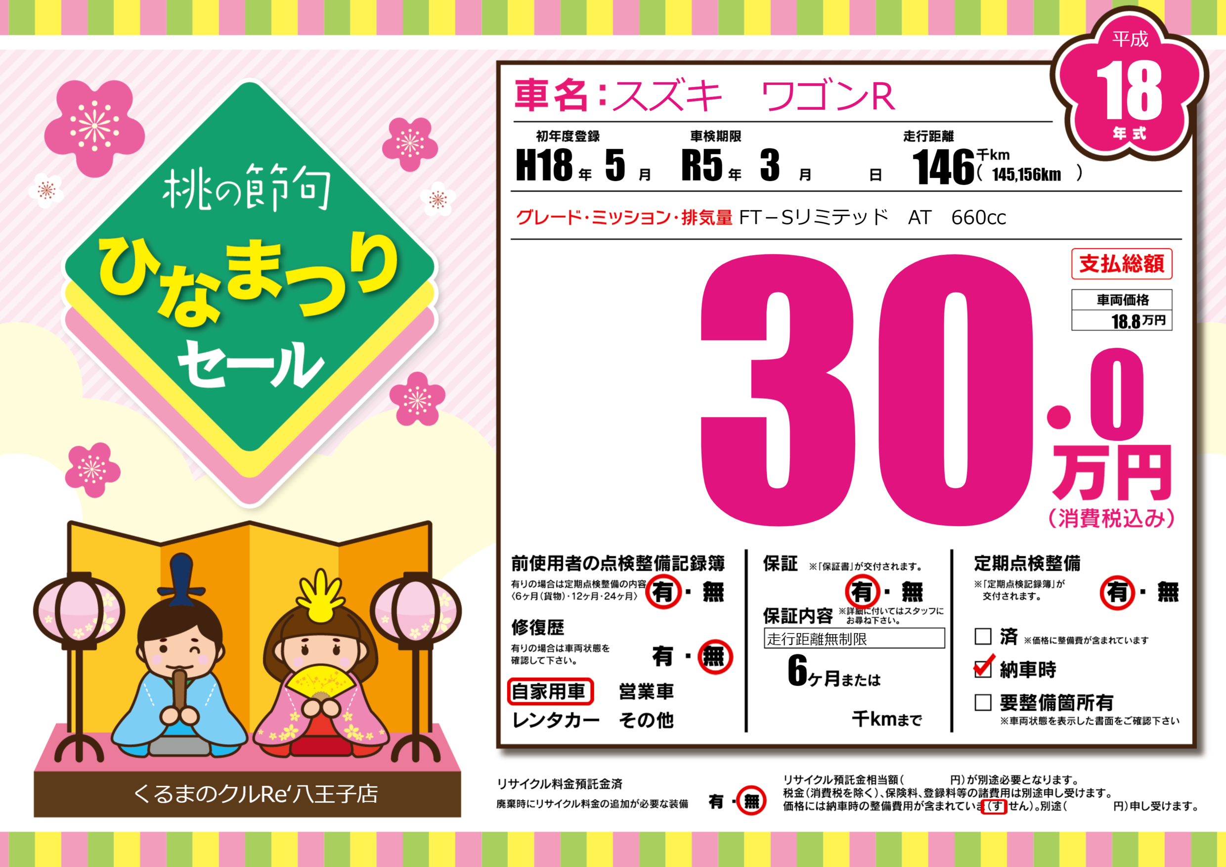 | 走行キロ | 14.6万km | 初年度登録 | H18年5月 |