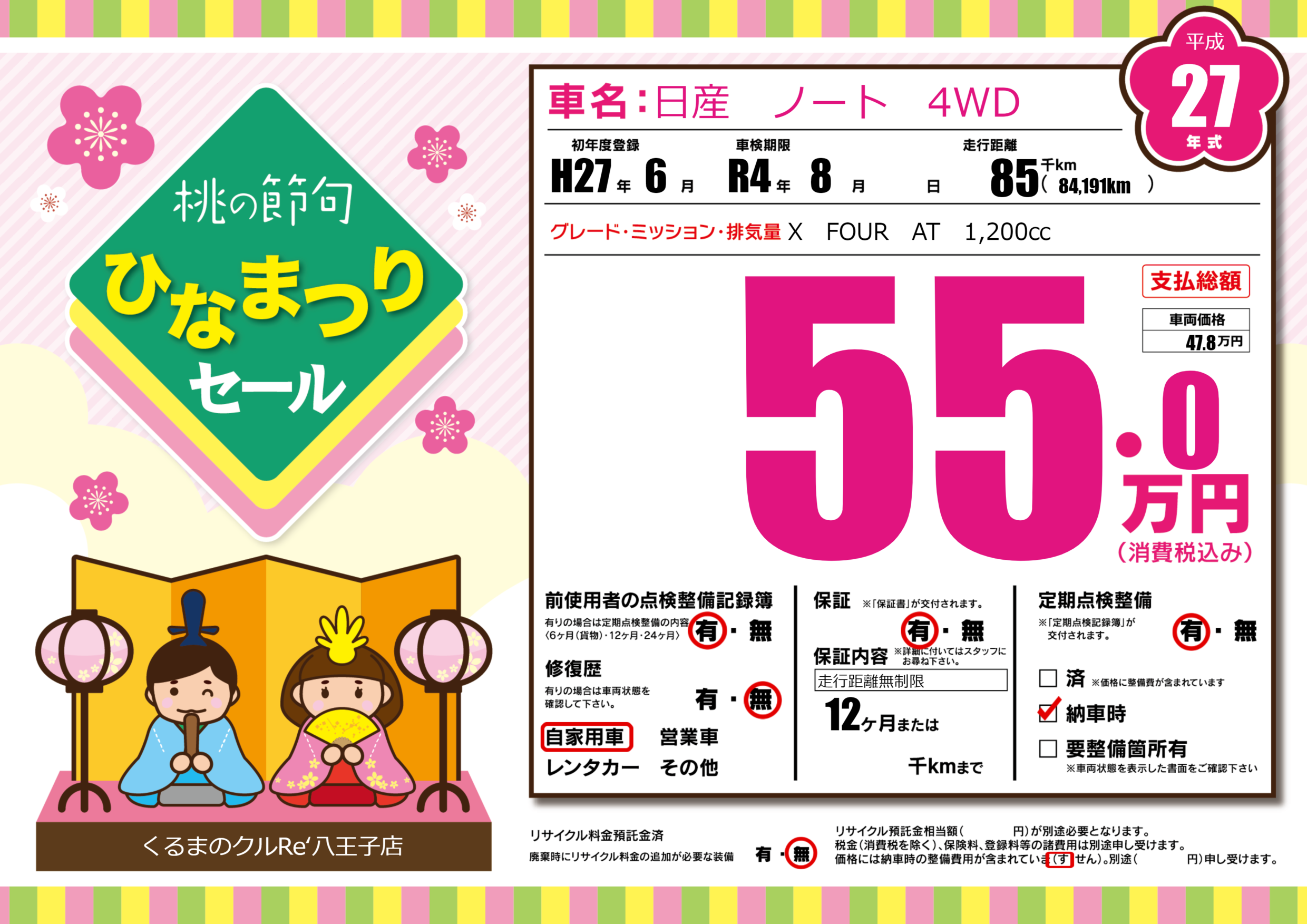 | 車名 | 日産 ノート 4WD | グレード ミッション 排気量 |