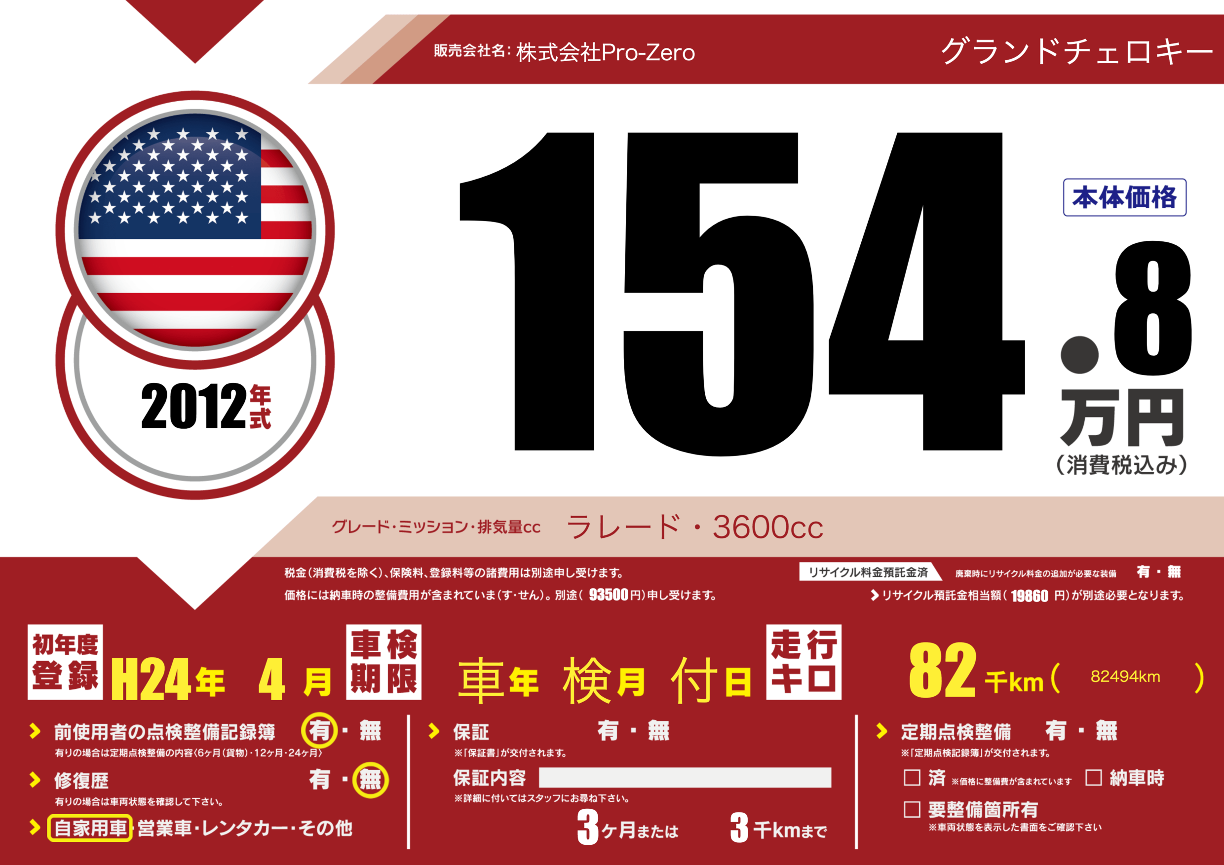 | 車名 | グランドチェロキー | グレード ミッション 排気量 |