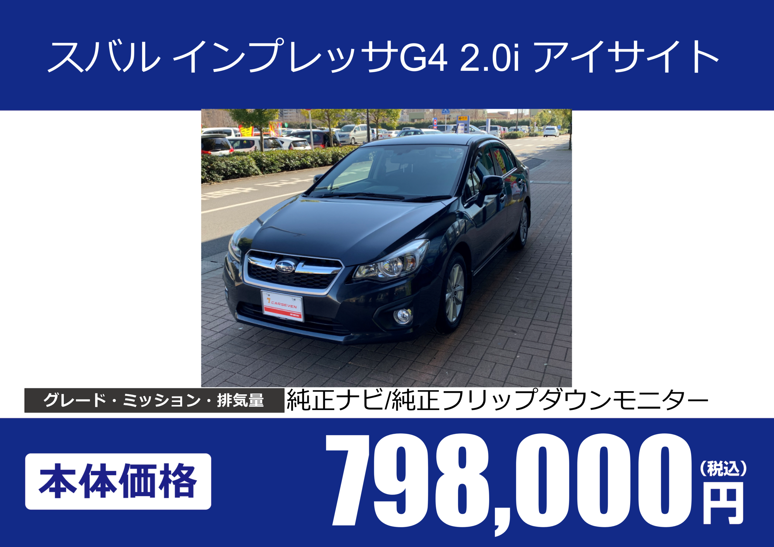 | 車名 | スバル インプレッサG4 2.0i アイサイト | グレード ミッション 排気量 |