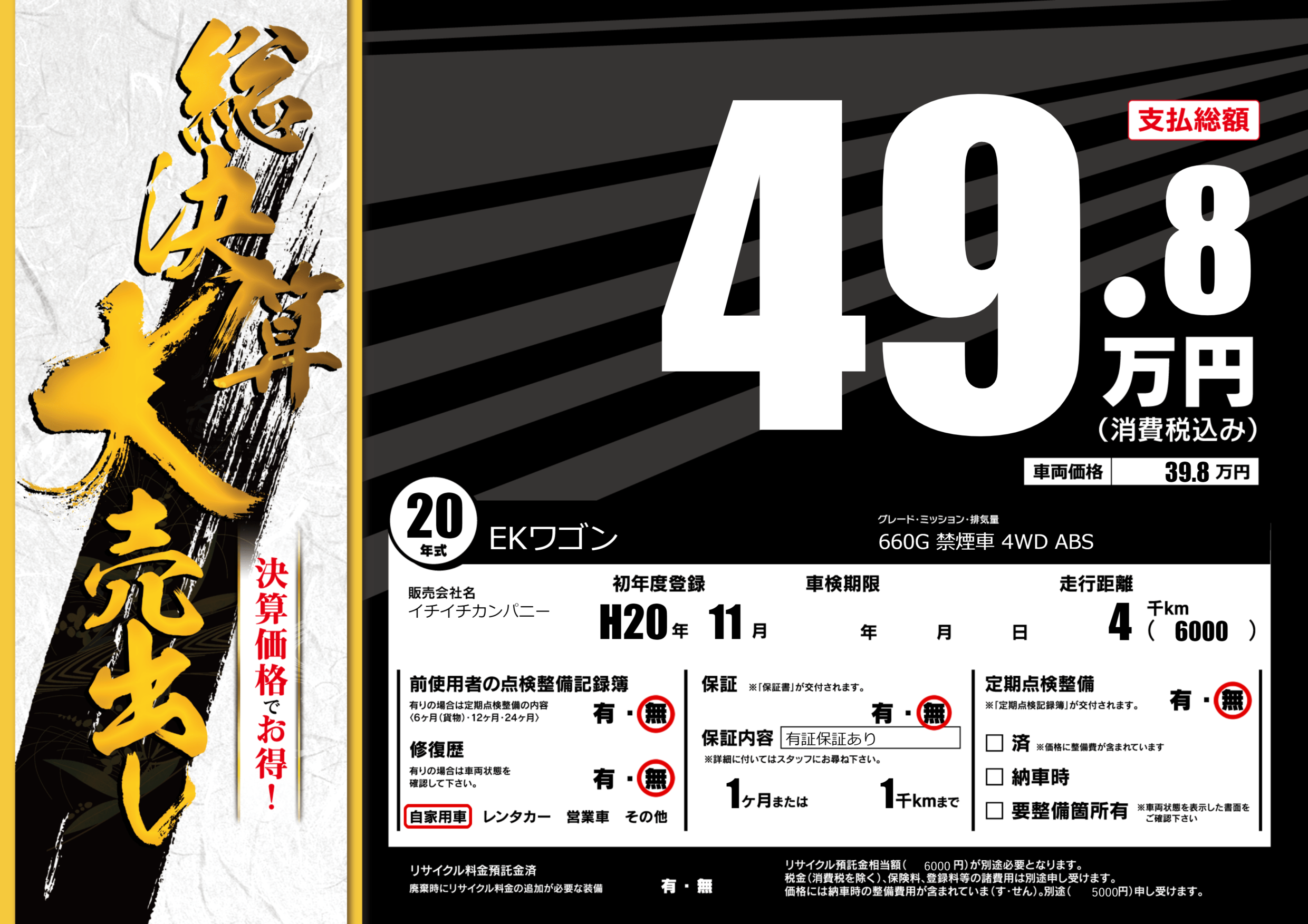 | 走行キロ | 0.4万km | 初年度登録 | H20年11月 |