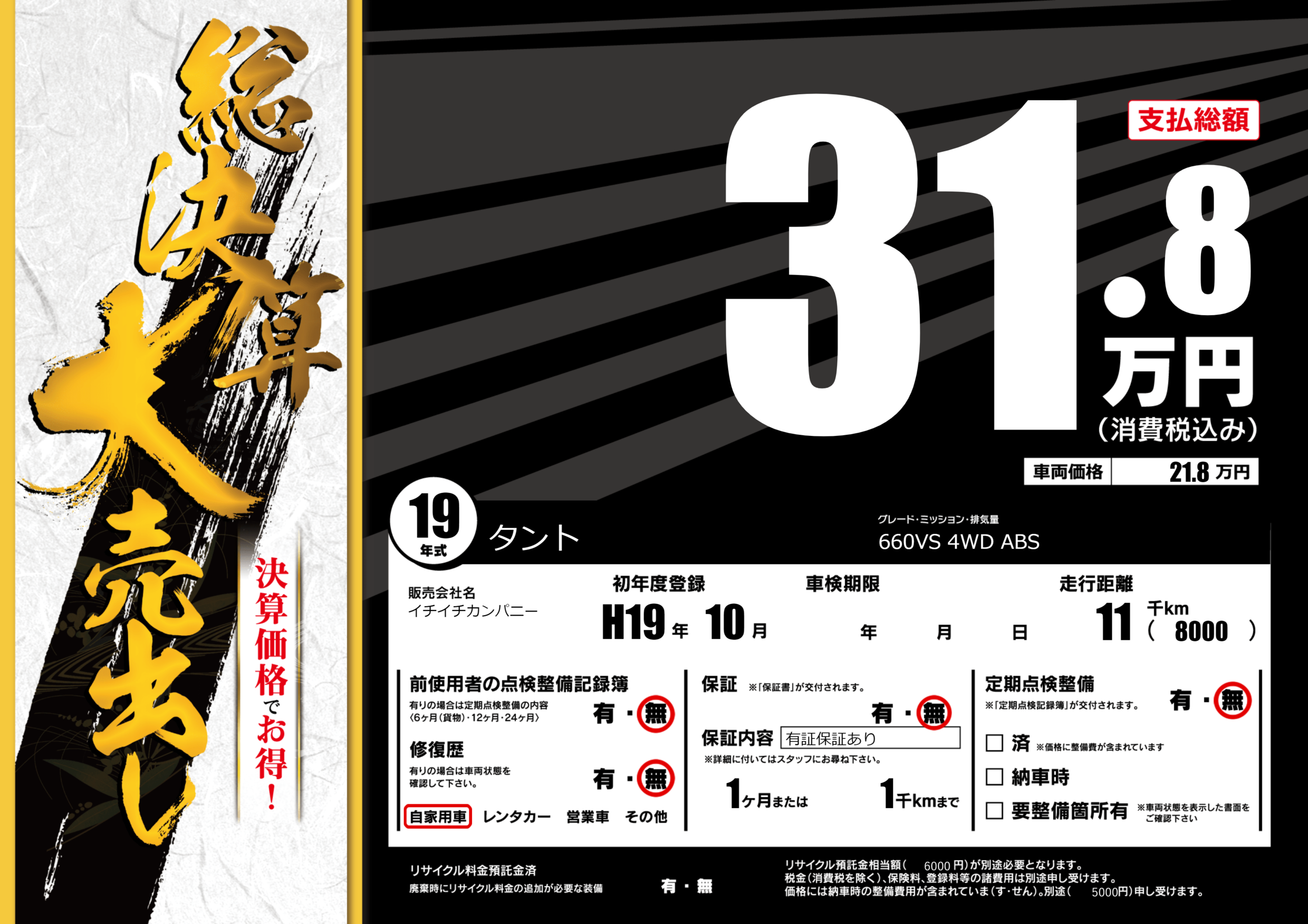 保証なし 保証内容(有証保証あり) 1ヶ月または(1)千kmまで |
