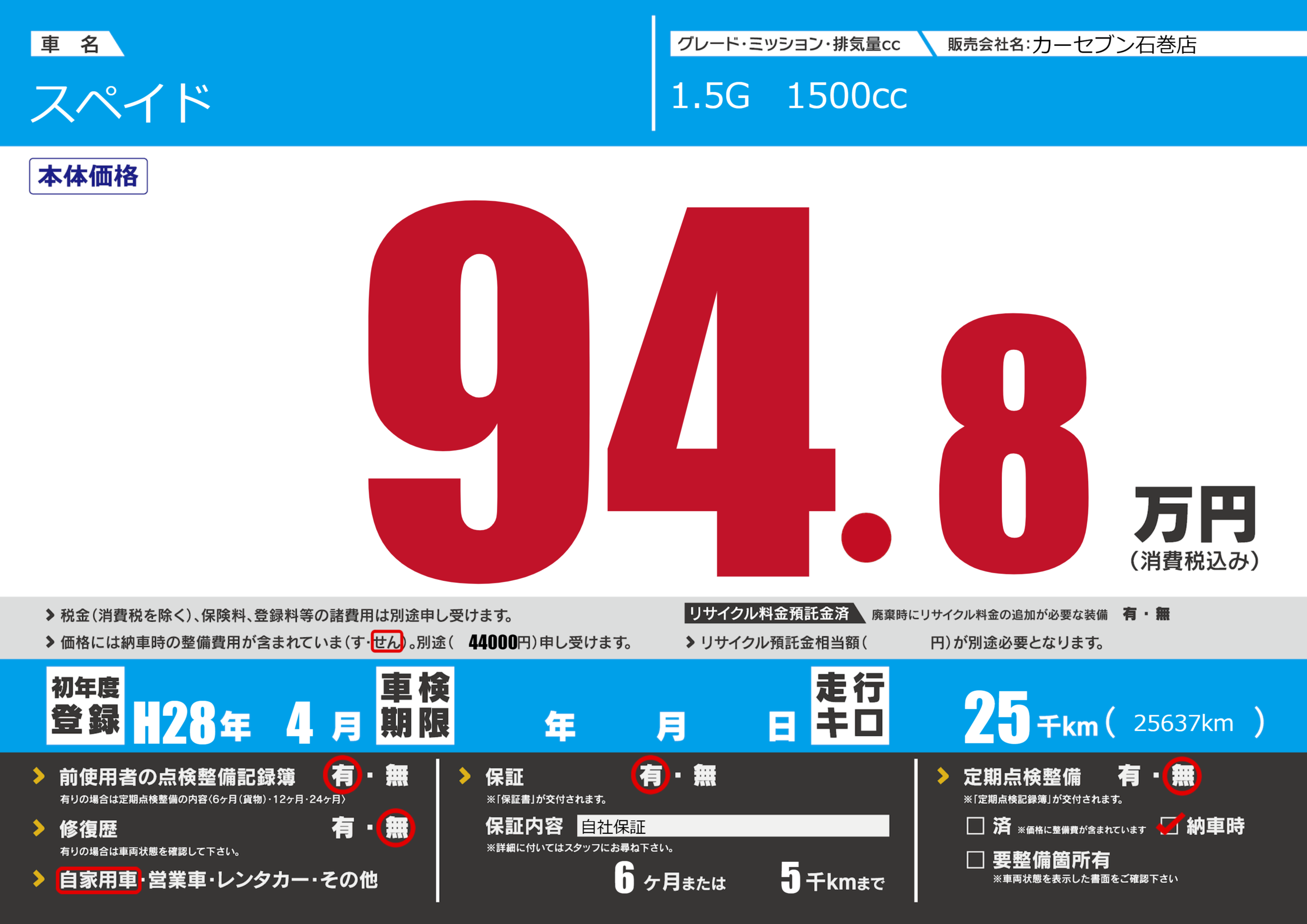 | 車名 | スペイド | グレード ミッション 排気量 |