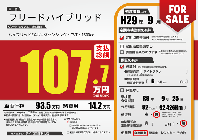 | 定期点検整備 | 定期点検整備あり 納車時あり | ||