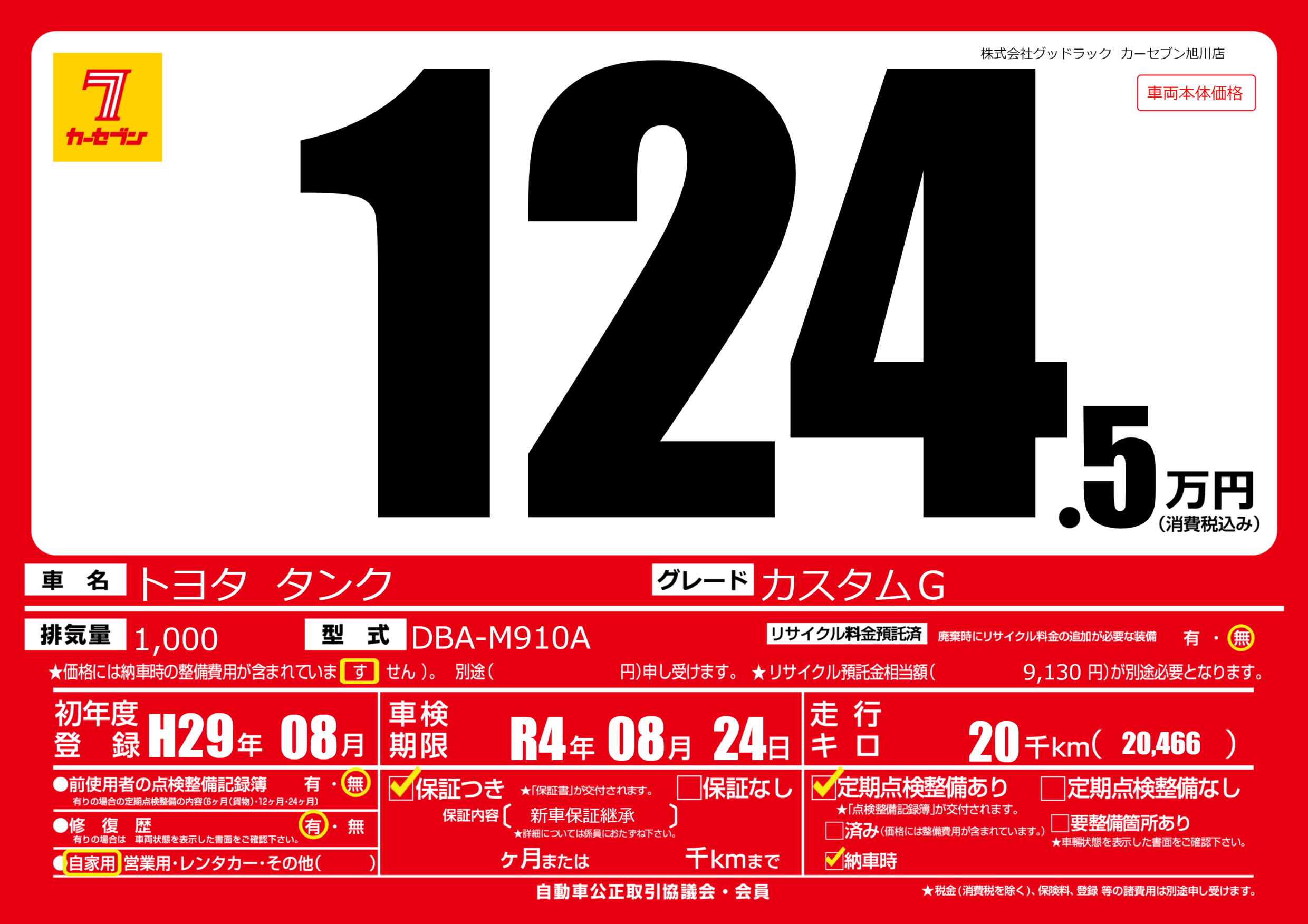 | 車名 | トヨタ タンク | グレード ミッション 排気量 |