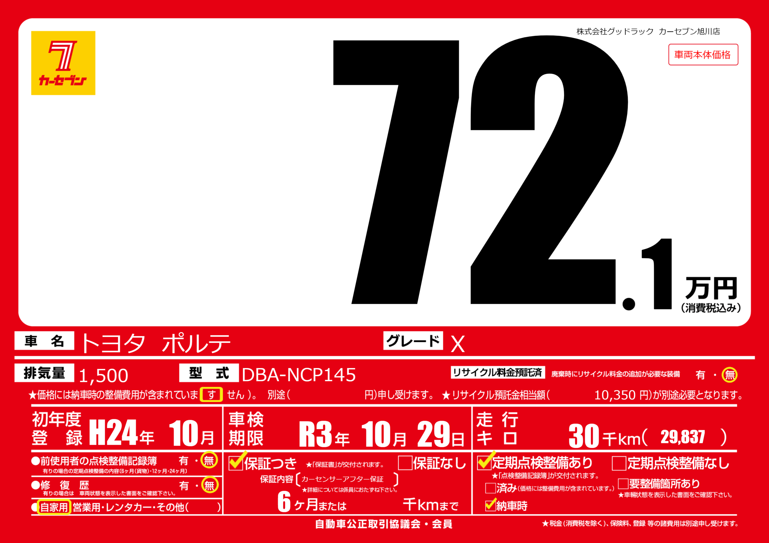 | 車名 | トヨタ ポルテ | グレード ミッション 排気量 |